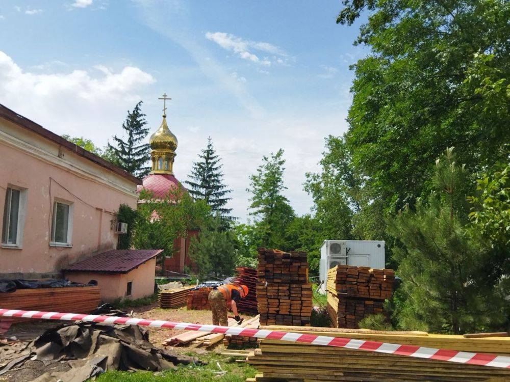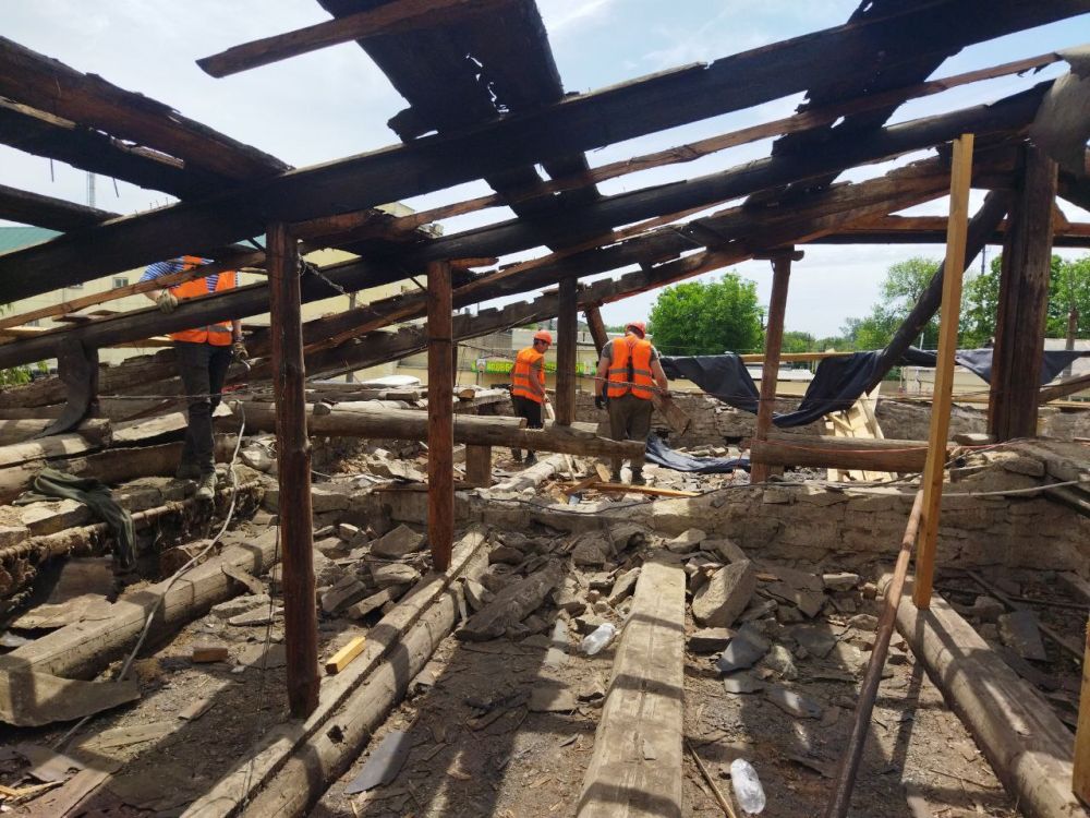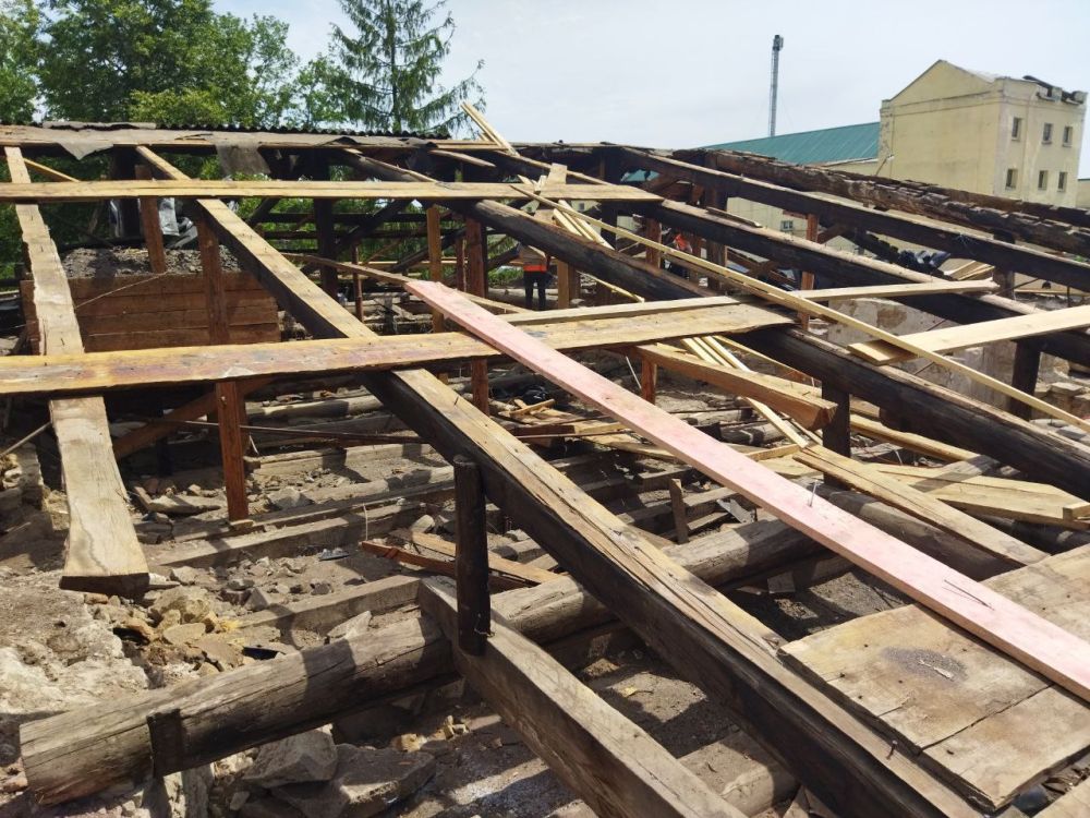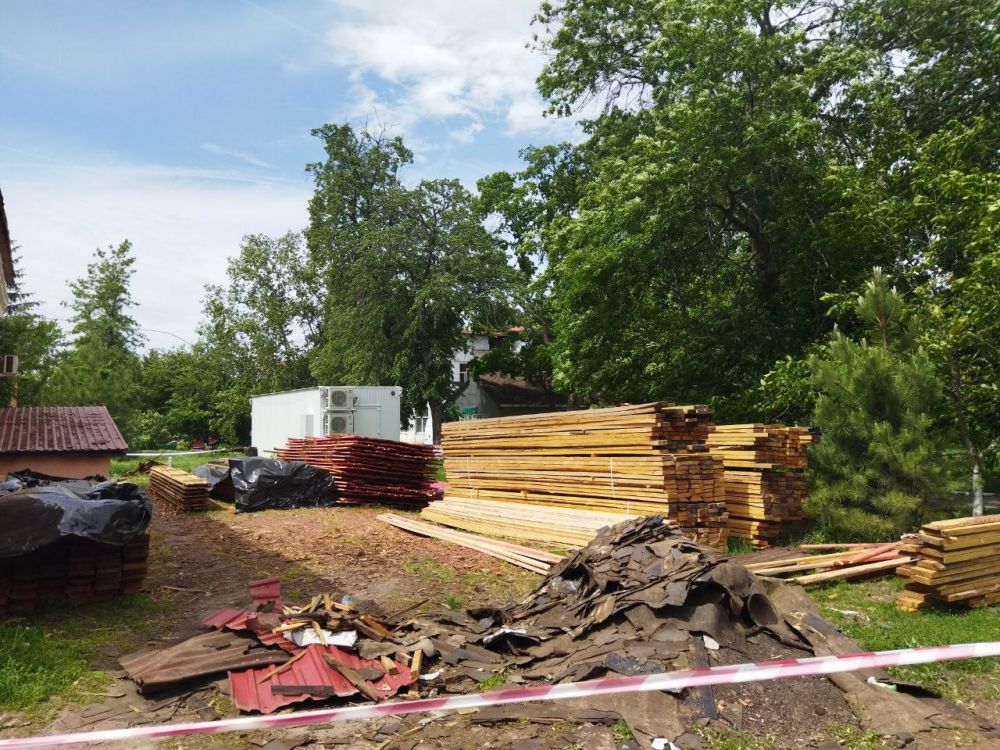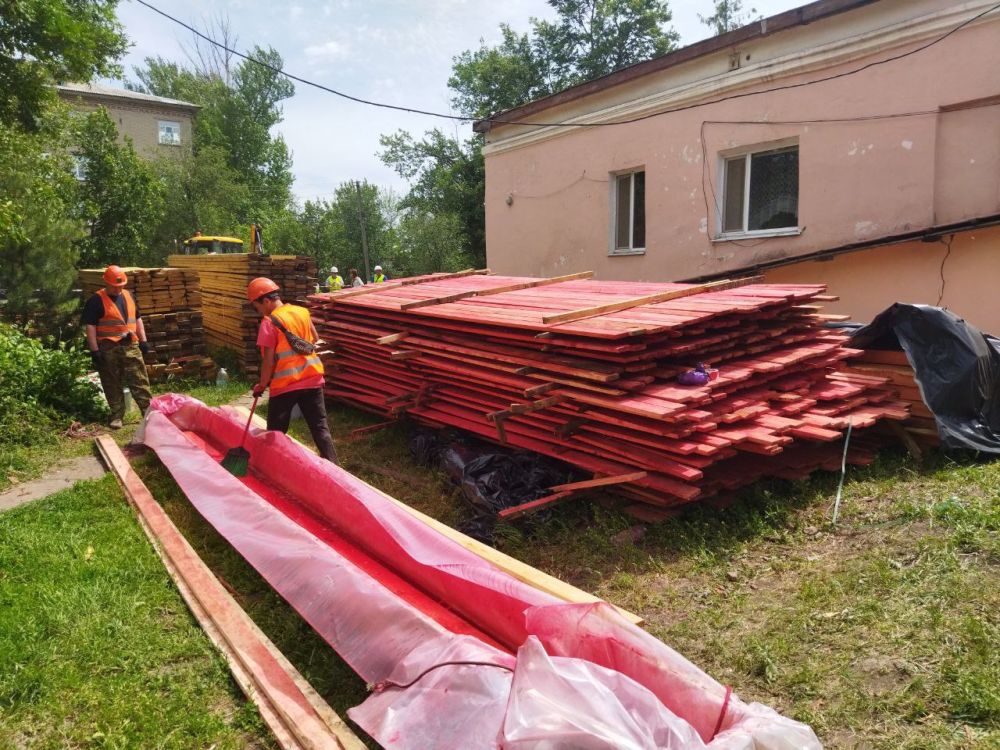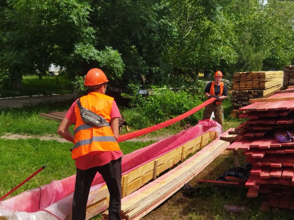 Подрядной организацией "Тонарт" на территорию учреждения доставлены строительные материалы. Работники предприятия начали подготовительные работы, в ходе которых проводят огнезащитную обработку материалов из древесины. Также ведется демонтаж несущих элементов кровли: старого кровельного покрытия, балок, стропильных ферм, обрешетки.