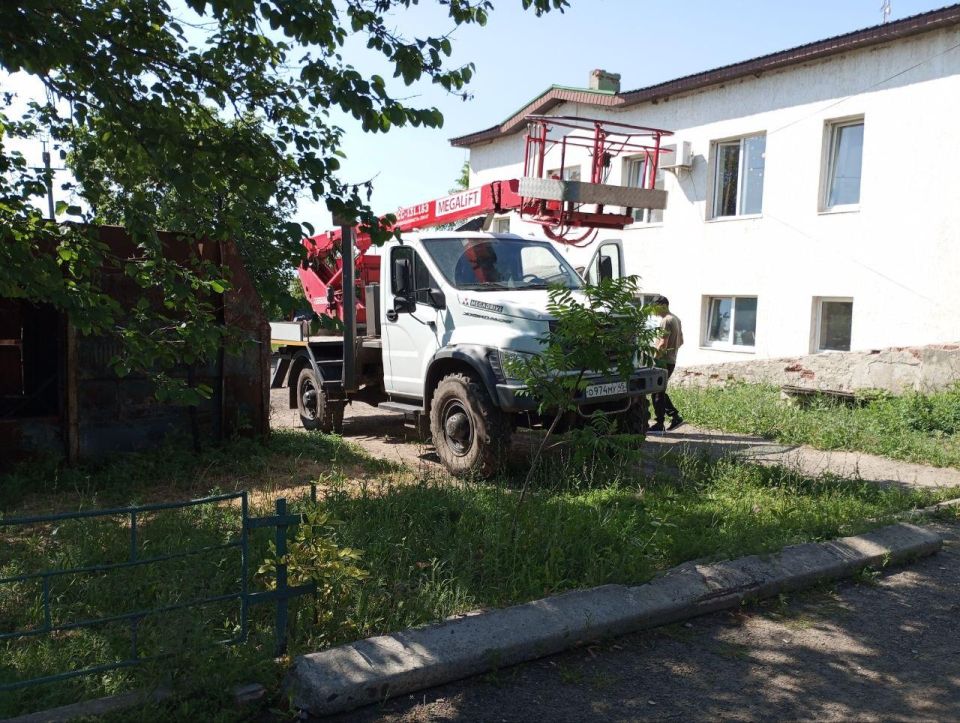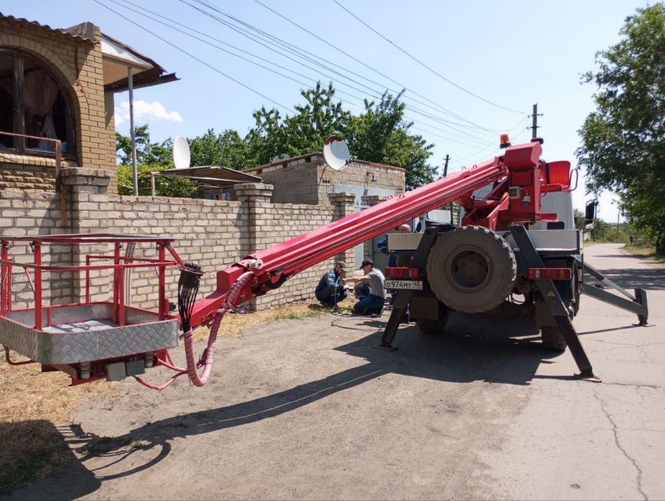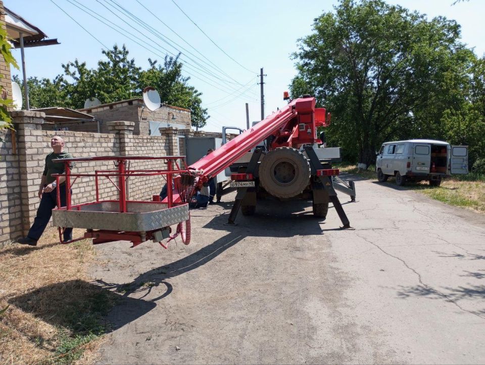 Курганские энергетики совместно с коллегами из Краснодонского РЭС оперативно приступили к ликвидации поврежденных участков линий электропередач, используя специализированную технику, включая автовышку.