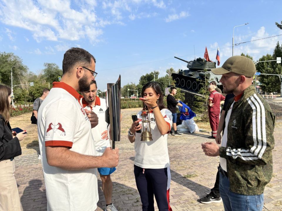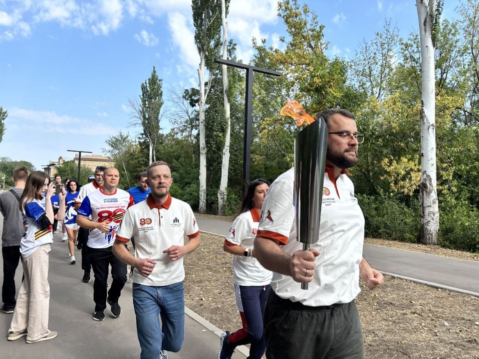 Пробежать с частицей Вечного огня удостоился заместитель Секретаря Луганского реготделения партии «Единая Россия» Александр Криеренко. Его ему передала Екатерина Раззаакова.
