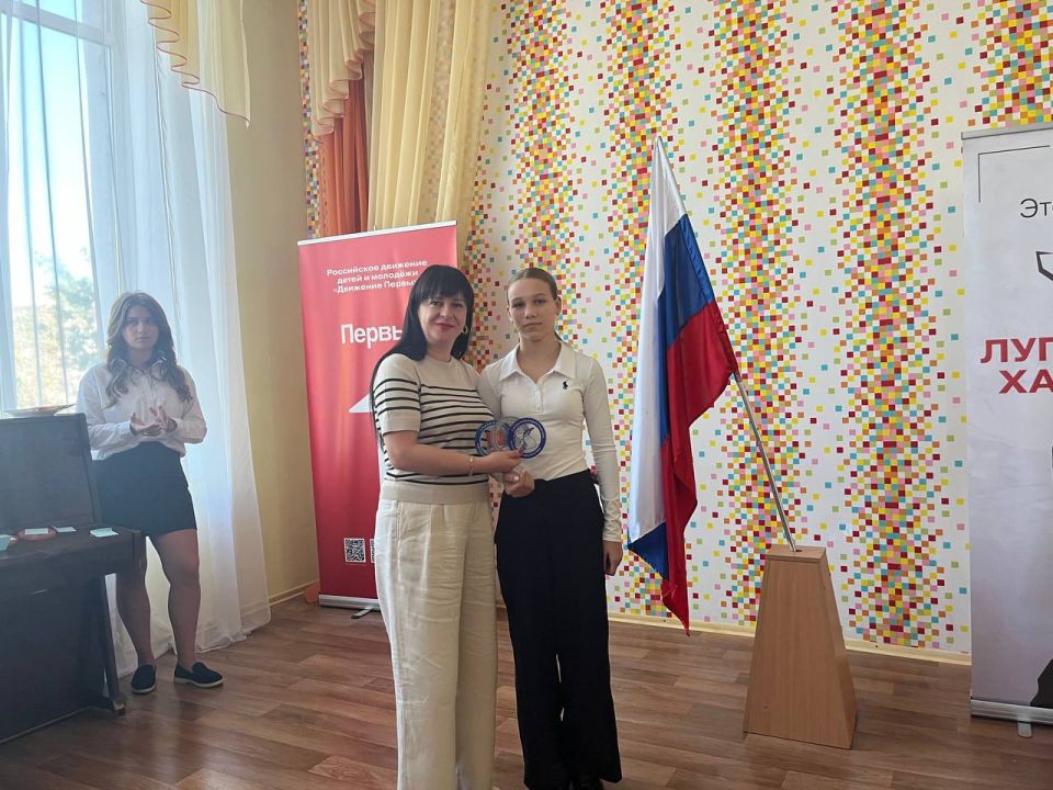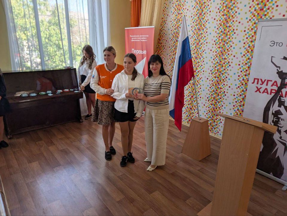 Директор гимназии Людмила Добрая и советник Ангелина Шевченко вручили награды активистам, подчеркнув важность воспитания в себе лучших качеств, присущих жителям Луганщины.