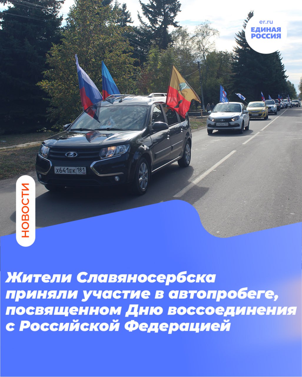 В День воссоединения ДНР, ЛНР, Запорожской и Херсонской областей с Российской Федерацией на Славяносербщине прошел праздничный автопробег. В нем приняли участие секретарь Славяносербского местного отделения «Единой России», депутат Народного Совета ЛНР Светлана Гизай, глава муниципалитета Сергей Крамаренко, председатель Совета округа, замсекретаря отделения партии Антонина Гречишкина, депутат Барнаульской городской думы Кристина Юстус, муниципальные депутаты, активисты партии и «Молодой Гвардии Единой России».