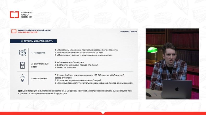 Спикеры вебинара – Владимир Сухарев, SMM-менеджер отдела связей с общественностью Департамента медиакоммуникаций и дизайна РГБ, и Илья Набоких, методист и куратор Школы креативного и стратегического мышления ИКРА, обсудили методы создания запоминающегося контента в онлайн-пространстве и рассказали о примерах классического и неклассического контента библиотечных групп.