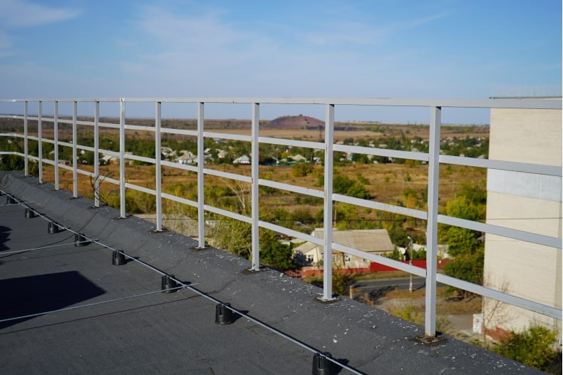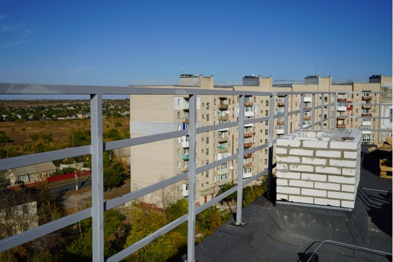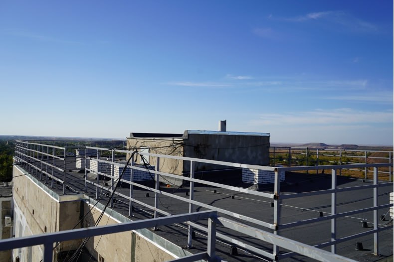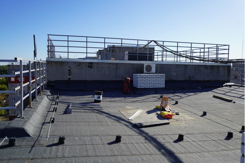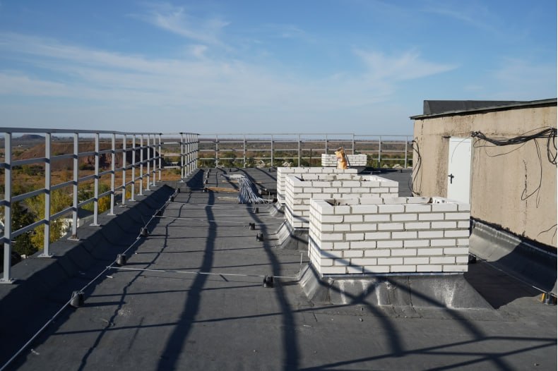 Аналогичные работы были проведены и на кровле дома №44, расположенного напротив. Здесь также установлено ограждение по всему периметру, смонтирована система заземления и выполнена отмостка. В настоящее время завершается установка защитных зонтиков на вентиляционные шахты.