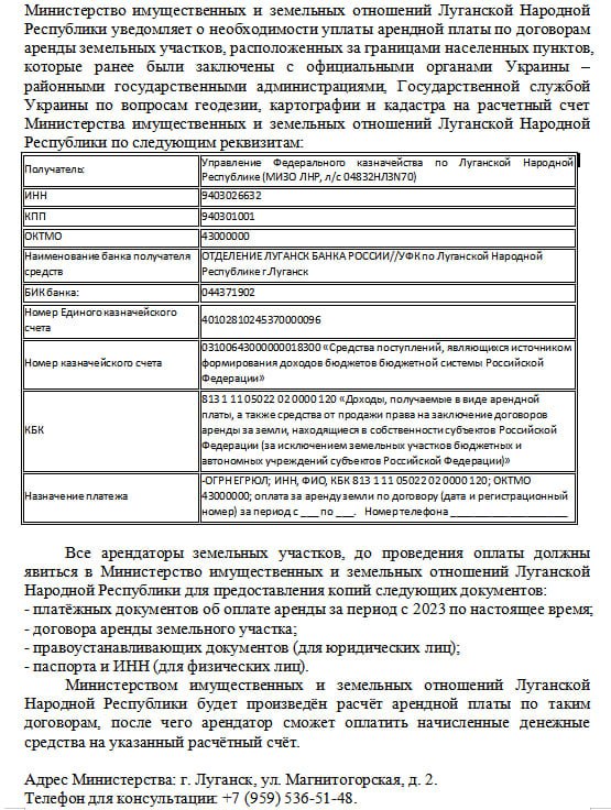Министерство имущественных и земельных отношений Луганской Народной Республики уведомляет о необходимости уплаты арендной платы по договорам аренды земельных участков, расположенных за границами населенных пунктов, которые ранее были заключены с официальными органами Украины – районными государственными администрациями, Государственной службой Украины по вопросам геодезии, картографии и кадастра на расчетный счет Министерства имущественных и земельных отношений Луганской Народной Республики