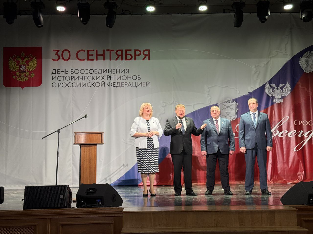 На праздничном концерте по случаю Дня воссоединения с Россией заместитель Председателя Народного Совета ЛНР Денис Колесников зачитал поздравительный адрес Главы ЛНР Леонида Пасечника: