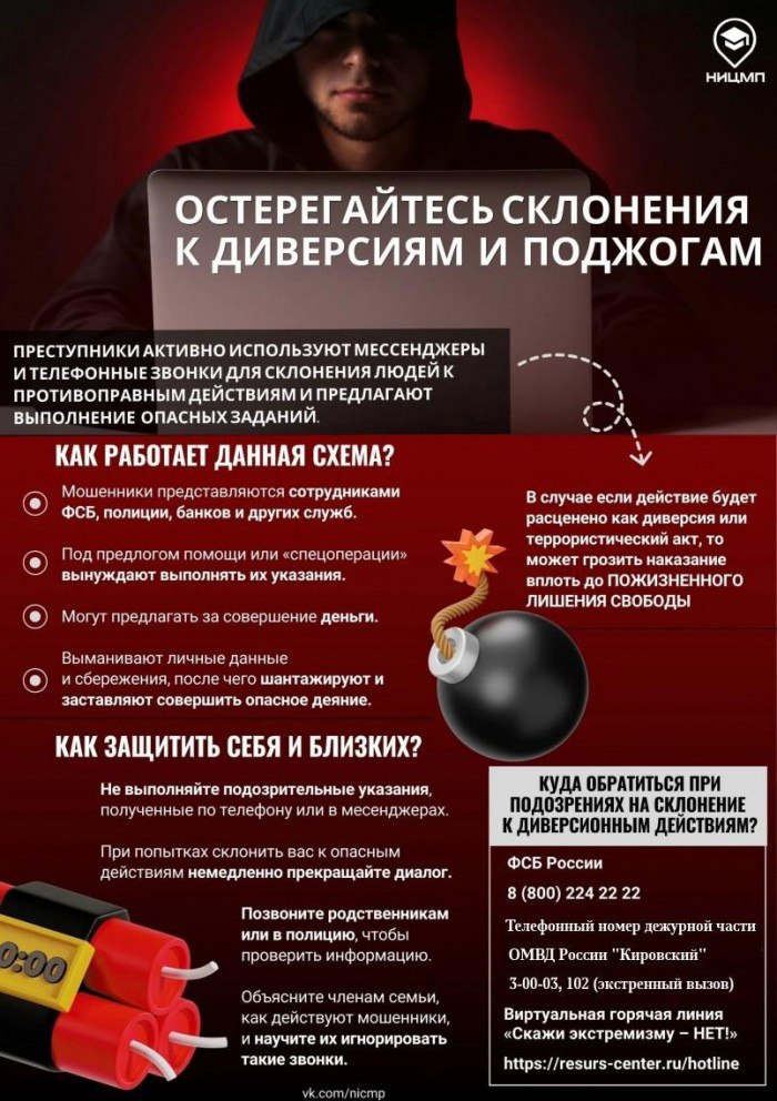 Не поддавайтесь на данные обещания и угрозы! Совершение диверсий (Статья 281 УК РФ) и террористических актов (Статья 205 УК РФ) наказывается лишением свободы от 10 лет до пожизненного заключения. Будьте бдительны!