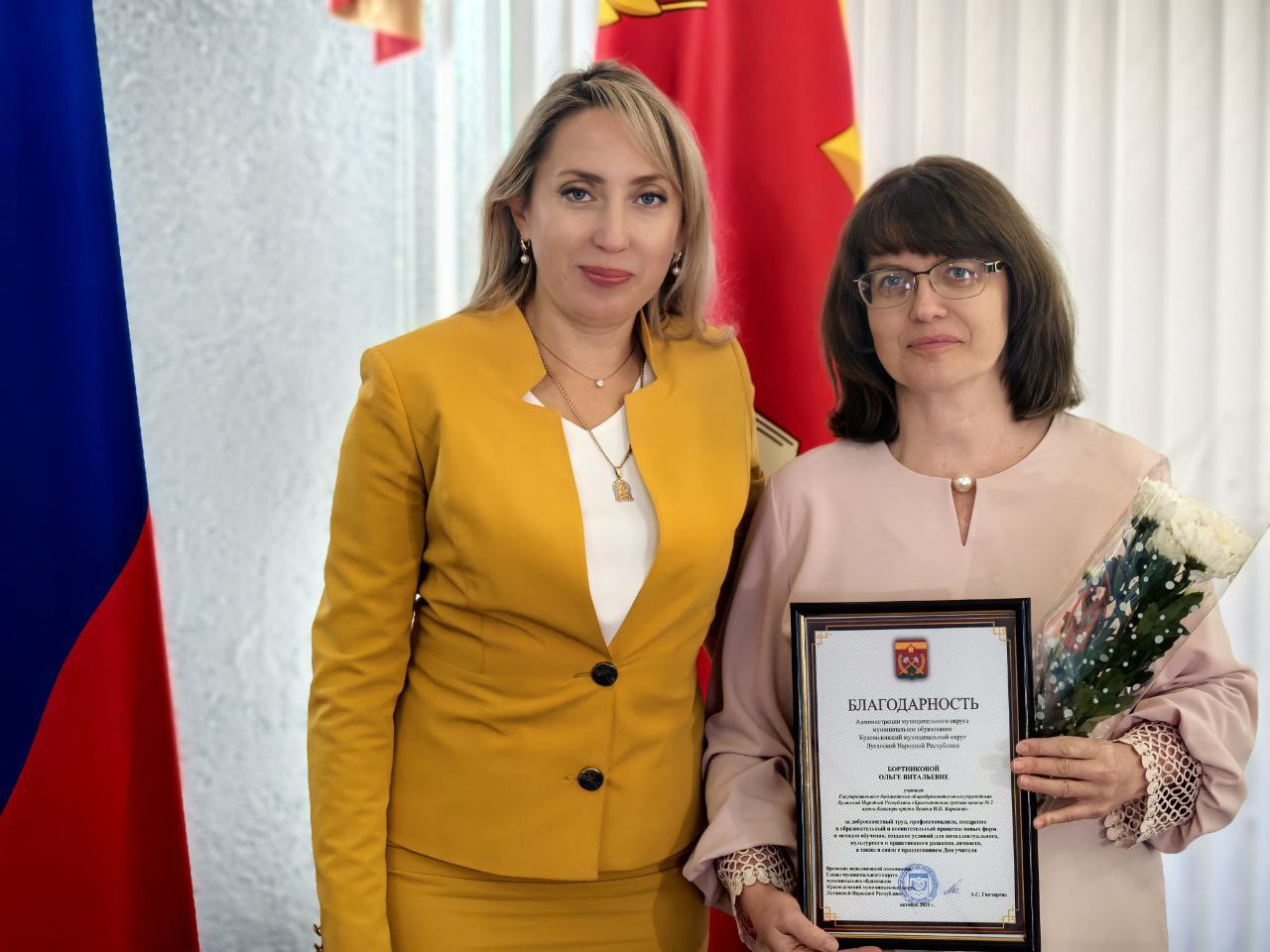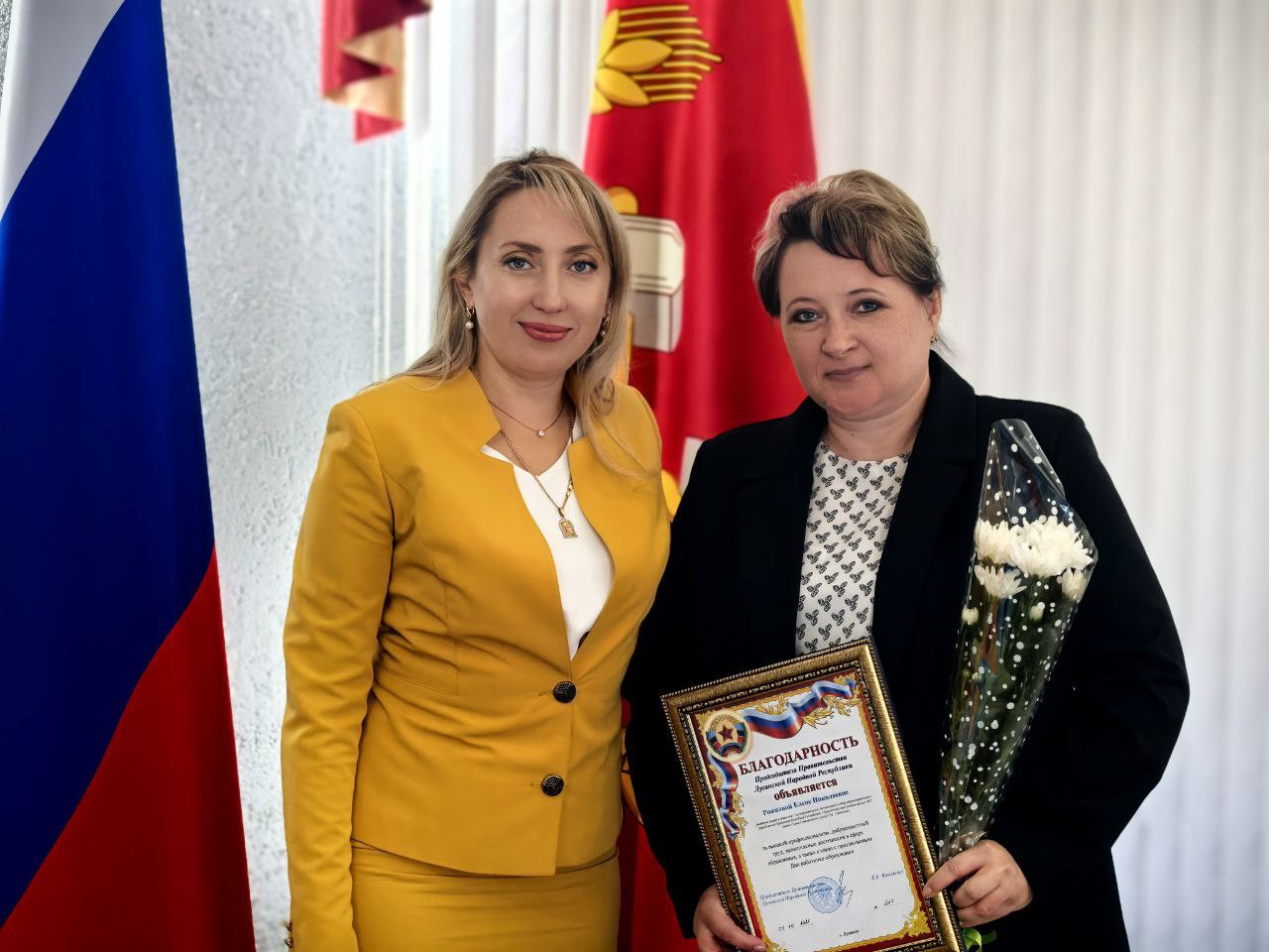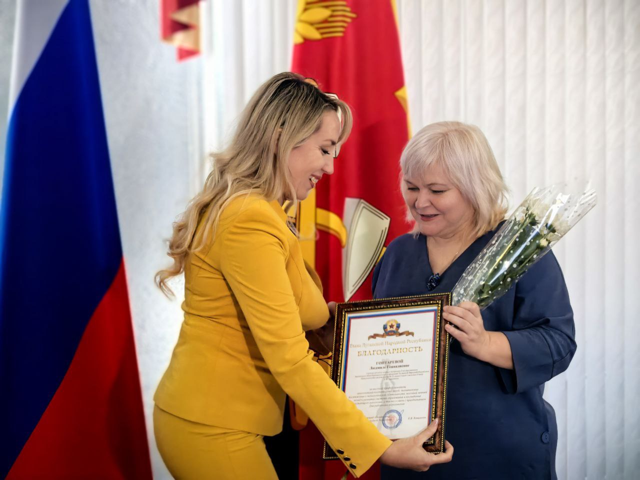 В рамках торжественного приема состоялось вручение наград за добросовестный труд и значительный вклад в развитие системы образования Краснодонского муниципального округа. Благодарности Главы Луганской Народной Республики были вручены Глушко Нине Цезариевне и Гонтаревой Людмиле Геннадиевне. Также Благодарность Председателя Правительства Луганской Народной Республики получила Рожкова Елена Николаевна. Кроме того, педагоги округа были отмечены Благодарностями Администрации Краснодонского муниципального округа.