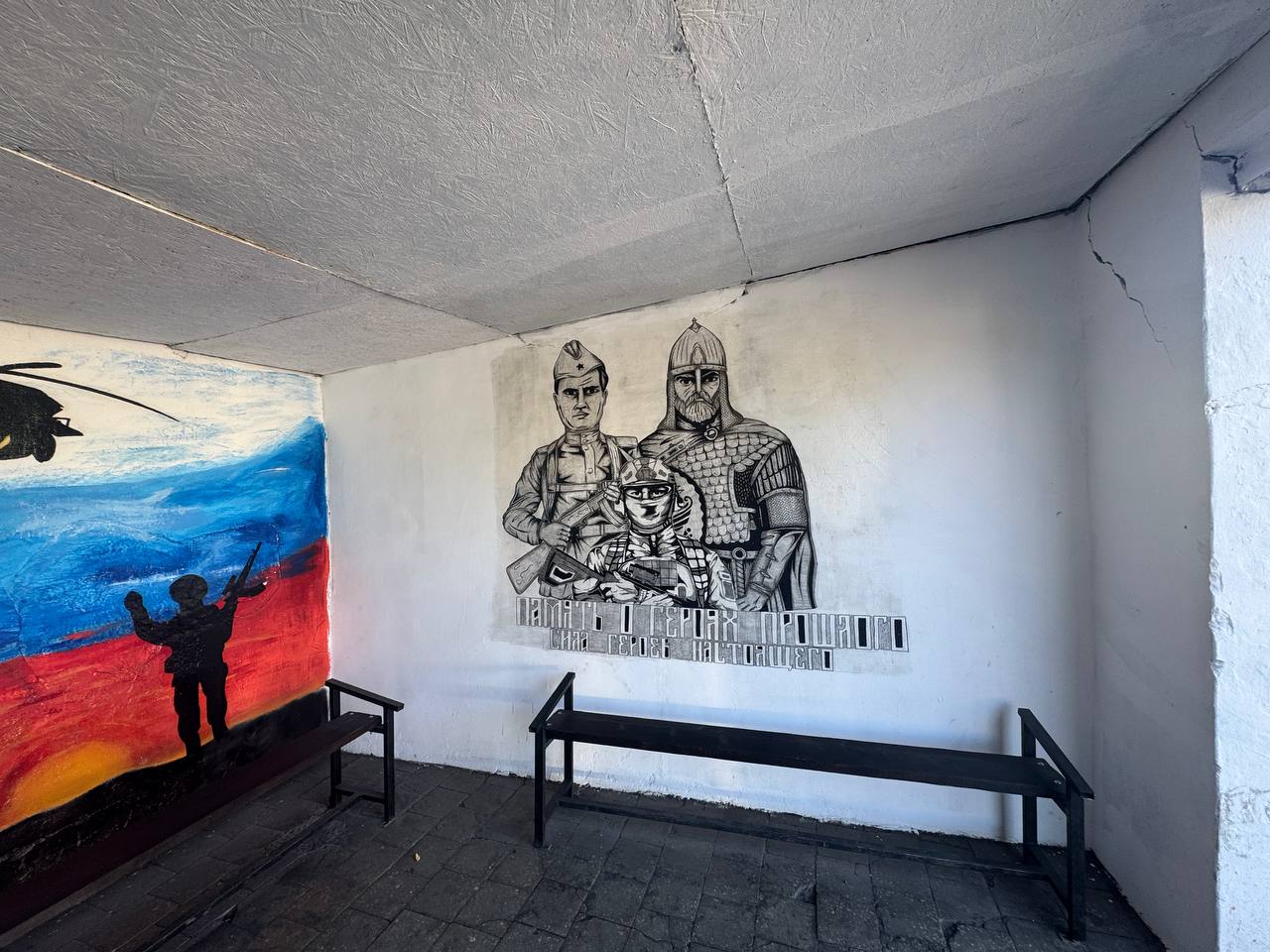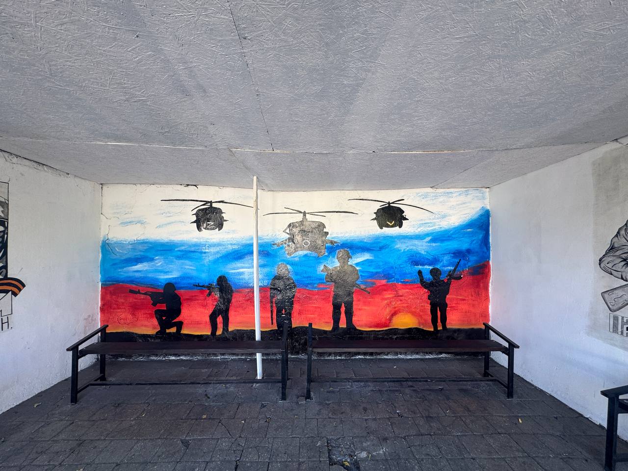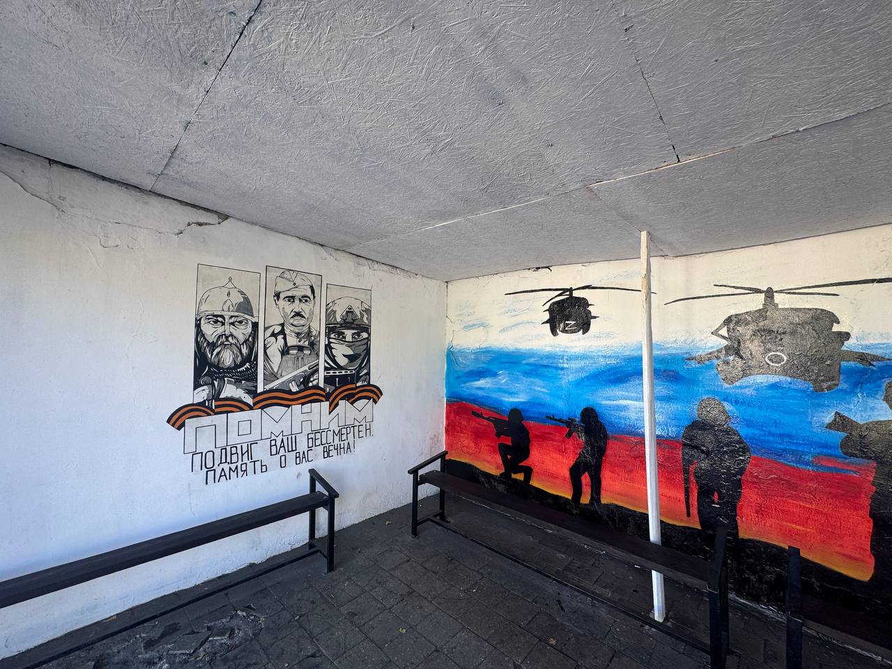 На данный момент сделана кровля крыши, установили комфортные лавочки, урны. Выполнена покраска в цвет государственного флага, на стенах остановки были нанесены патриотические рисунки.