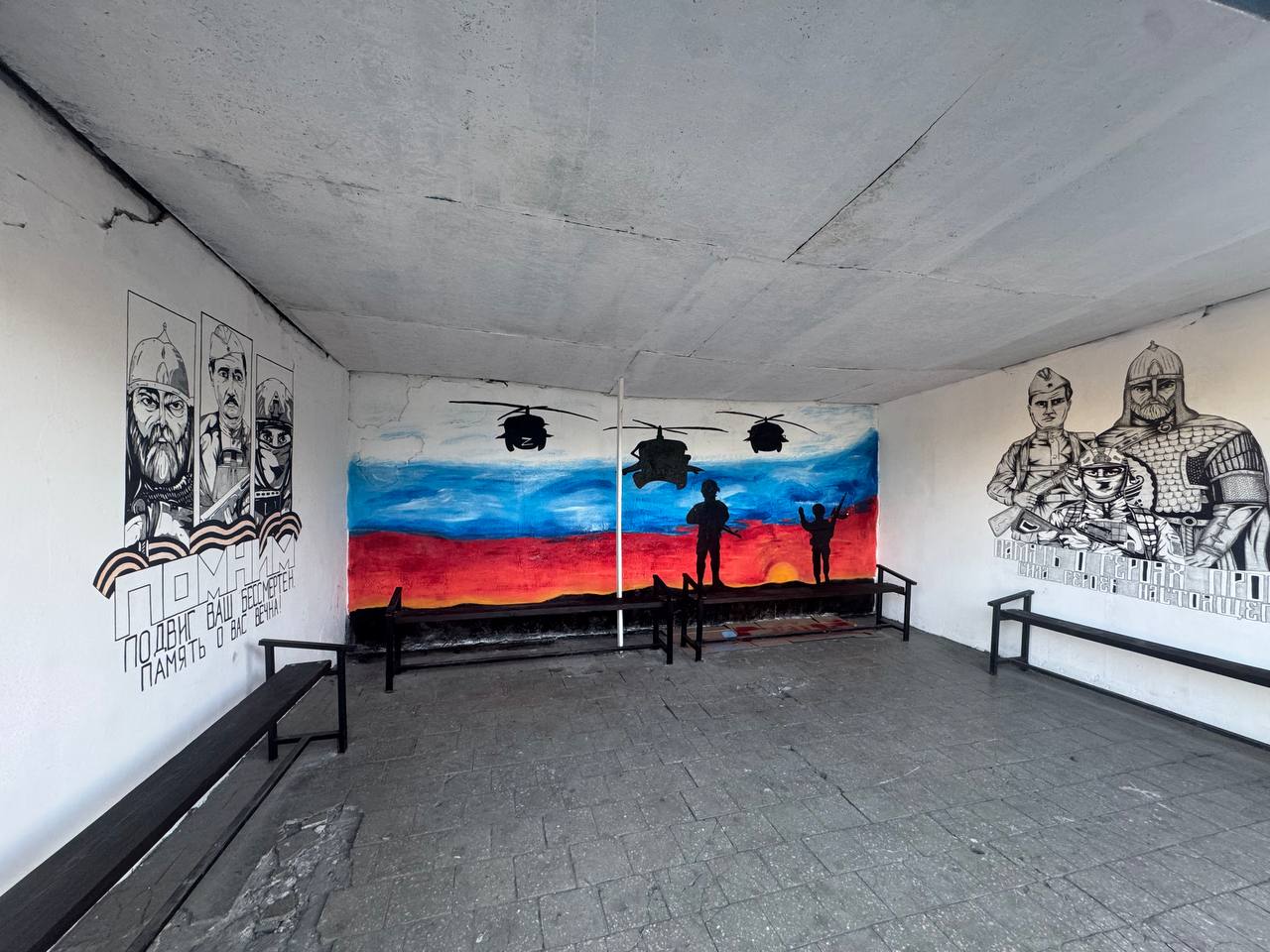 На данный момент сделана кровля крыши, установлены комфортные лавочки, урны. Выполнена покраска в цвет государственного флага, на стенах остановки нанесены патриотические рисунки.