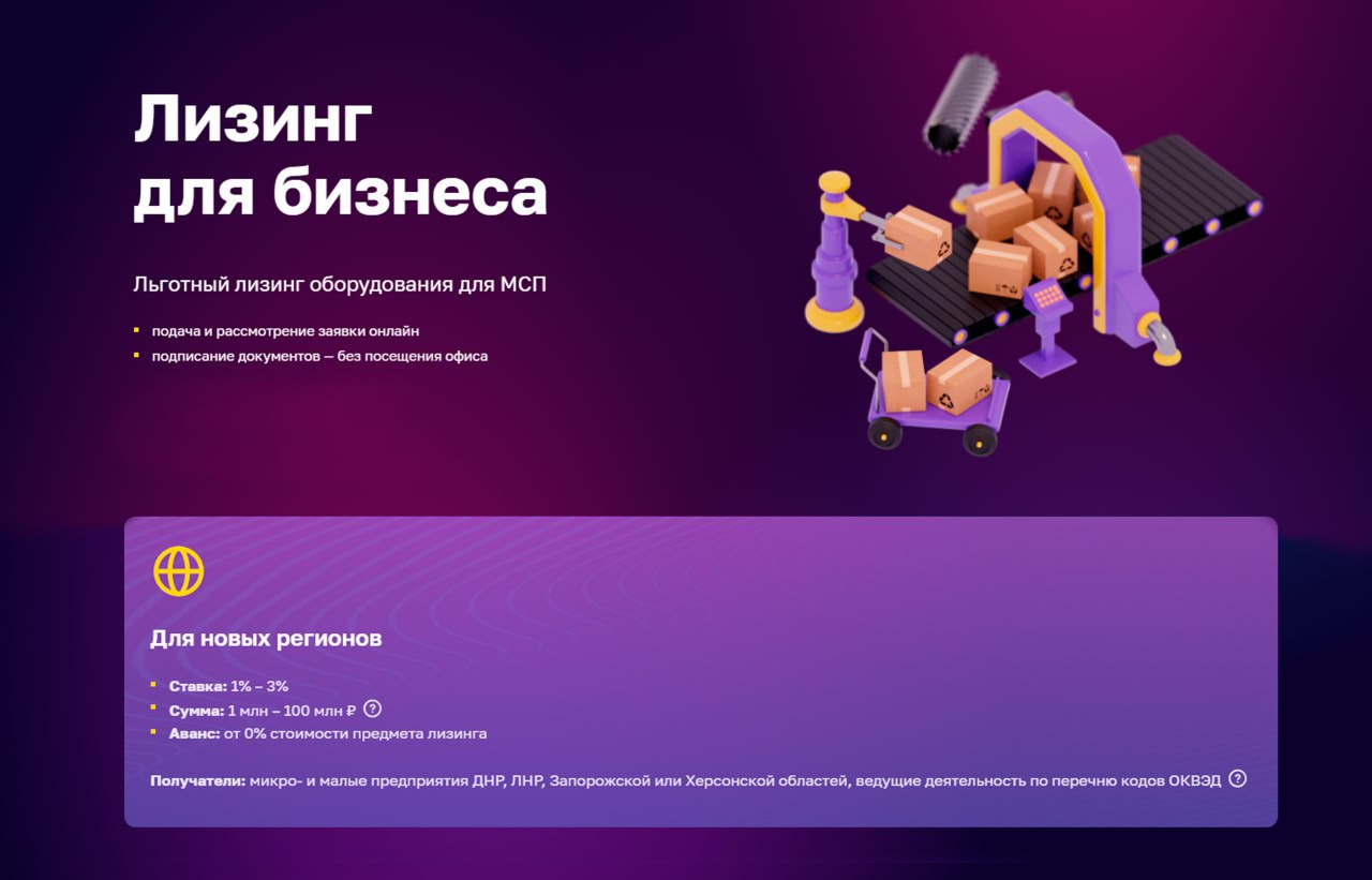 С 1 октября 2025 года вступили в силу новые условия льготного лизинга оборудования для субъектов малого и среднего предпринимательства, осуществляющих деятельность на новых территориях Российской Федерации. Данные условия предоставлены АО «МСП Лизинг» – дочерней компанией Корпорации МСП.
