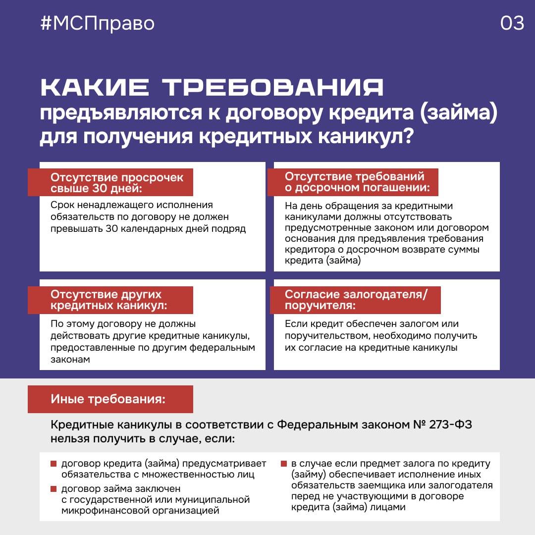 Каникулы можно оформить по нескольким кредитным договорам, но не чаще одного раза в 5 лет. В течение льготного периода на сумму кредита продолжат начисляться проценты по ставке, установленной в договоре, с ежемесячной капитализацией. Каникулы могут быть оформлены по кредитным договорам, заключенным до принятия закона, но не ранее 1 марта 2024 года.