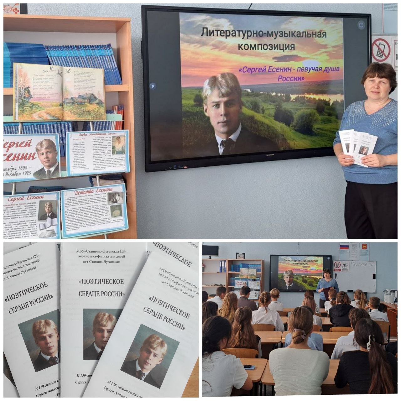 Станично-Луганская детская библиотека пригласила учащихся 8-х классов ГБОУ ЛНР «Станично-Луганская гимназия» на литературно-музыкальную композицию «Сергей Есенин - певучая душа России» к 130-летию со дня рождения великого русского поэта.