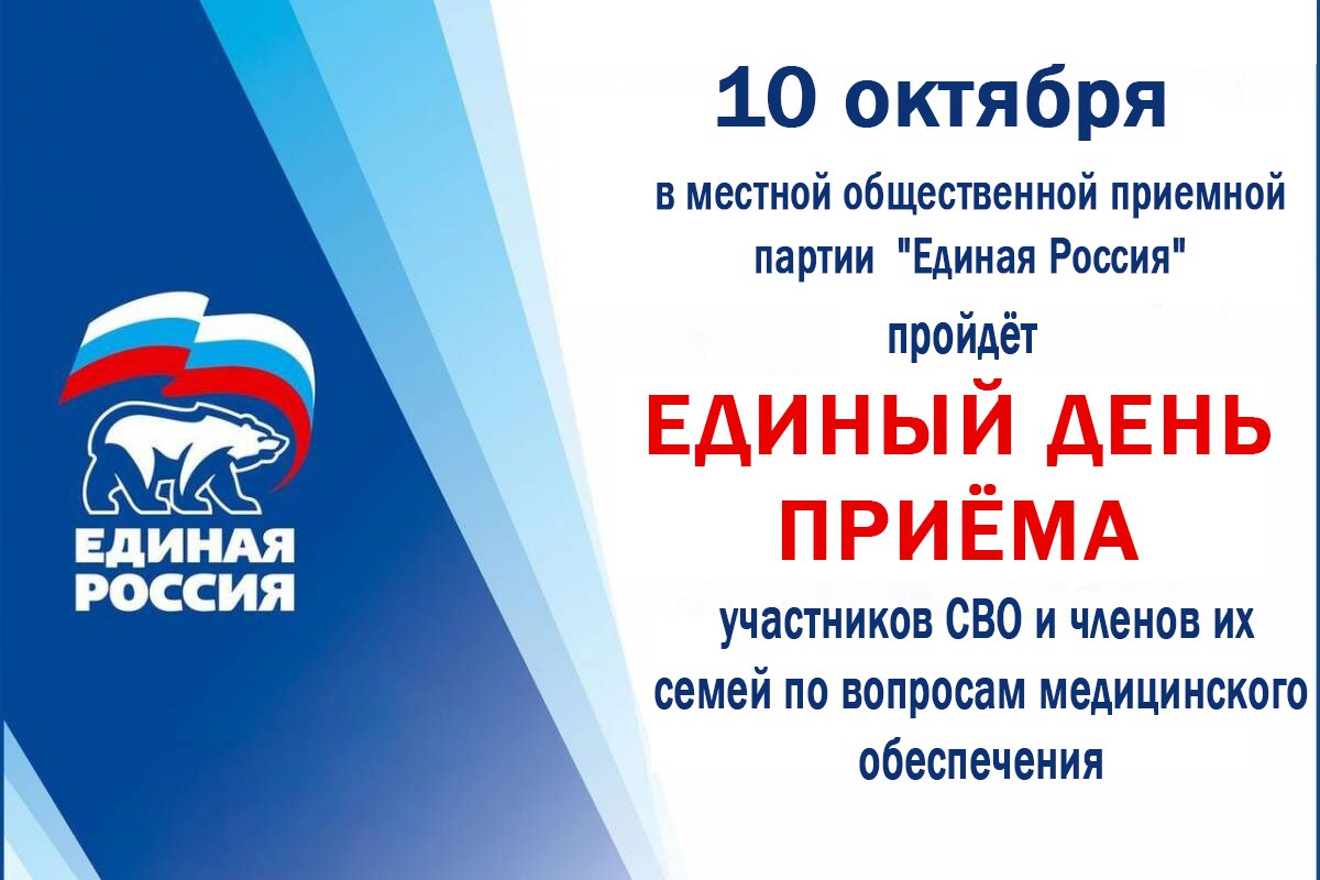 10 октября в общественной приемной Брянковского местного отделения партии «Единая Россия» пройдет Единый день приема, посвящённый вопросам медицинского обеспечения участников специальной военной операции и членов их семей.
