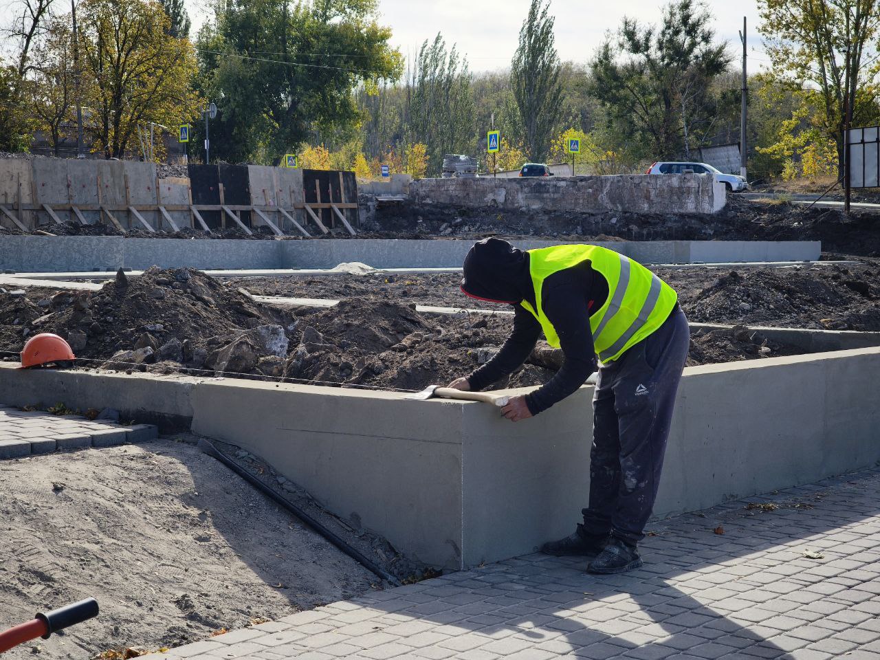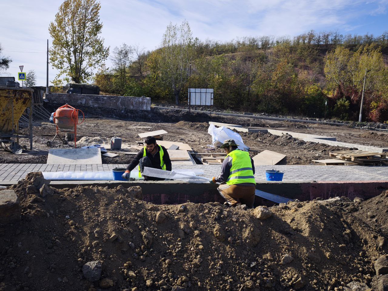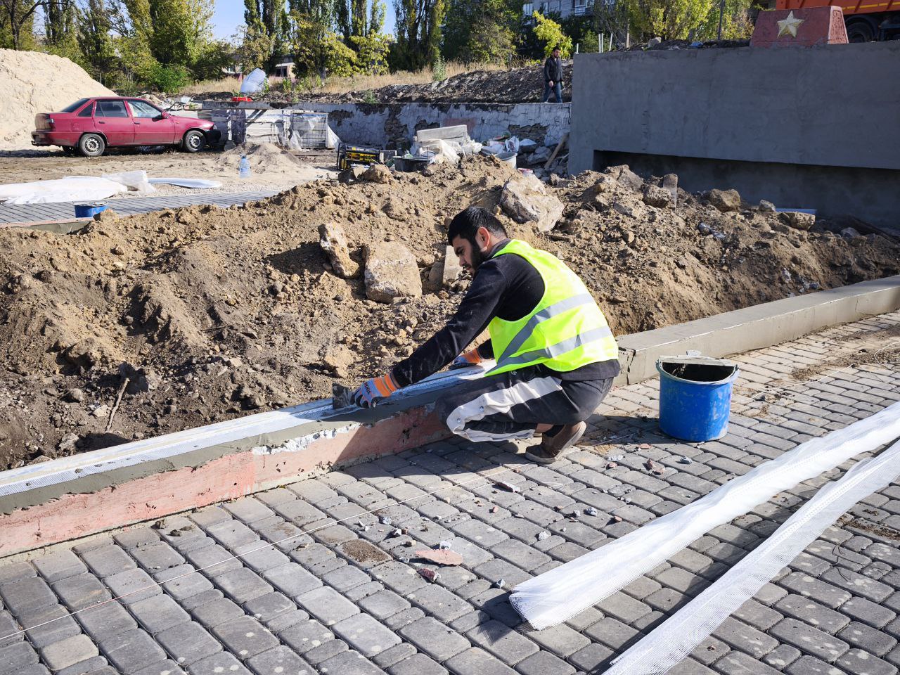 Подрядной организацией ведутся работы по укладке плитки, выполняется установка каркаса сцены, проектом так же предусмотрено установка световых точек и малых архитектурных форм, таких как скамейки и урны. Ведутся работы по укреплению исторического мемориала, а также планируется озеленение территории.