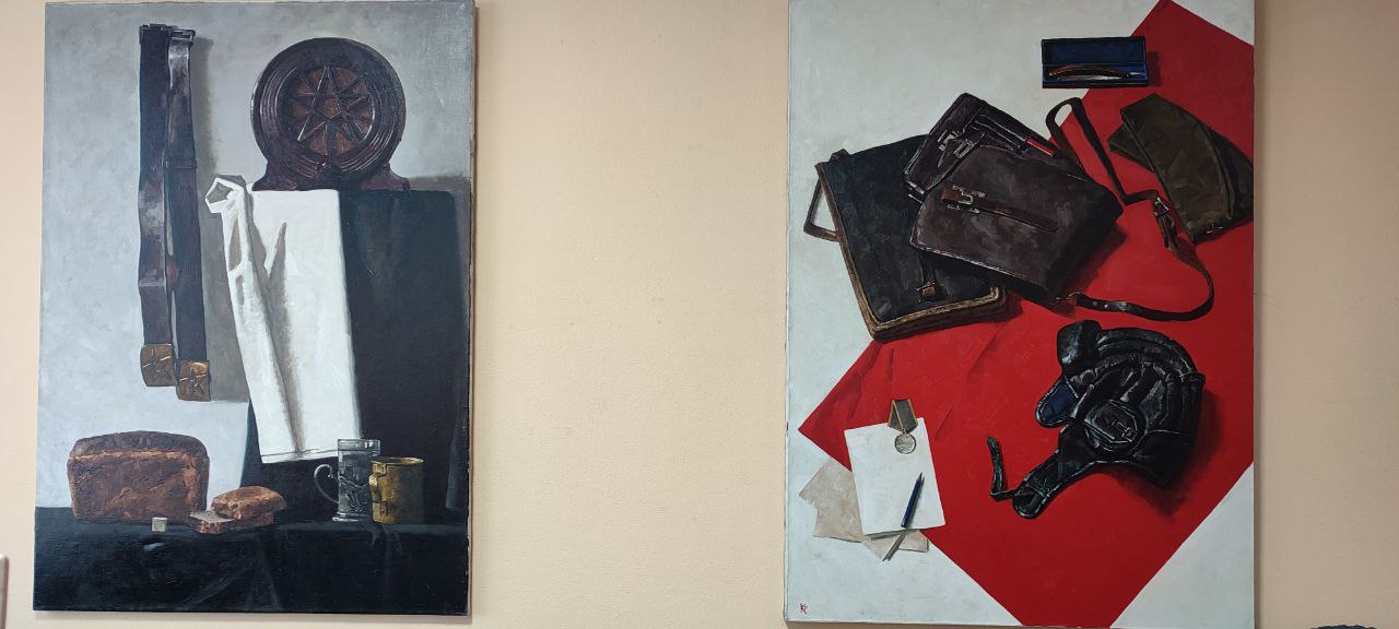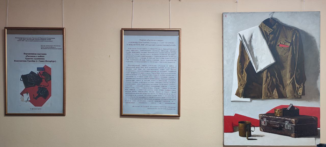 На выставке представлен монументальный триптих Константина Грачева «Рассказы о войне», который в своеобразной форме, через жанр натюрморта, доносит до нас остроту звучания этой темы. Этот триптих ассоциируется с плакатом военного времени, его эстетикой.