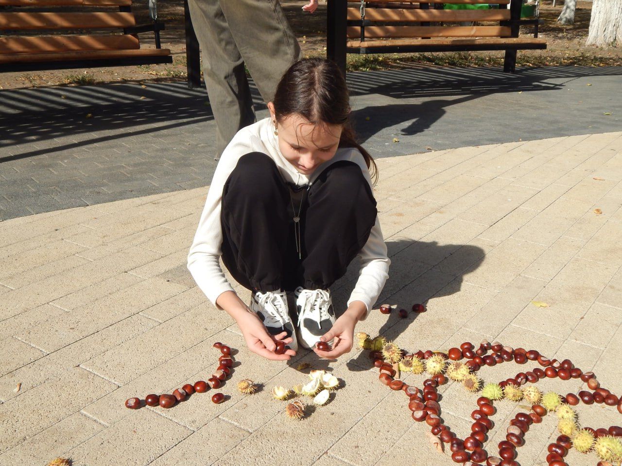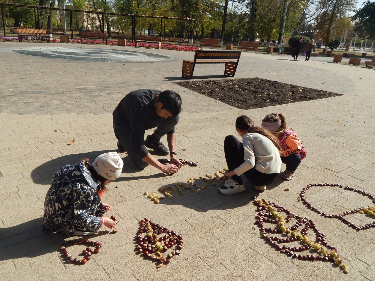 Под звуки задорной музыки, которая разносилась по аллеям, маленькие гости с энтузиазмом принялись за творчество. На гладком асфальте парка оживали удивительные картины: дети, словно настоящие художники, создавали из блестящих каштанов самые разнообразные и неповторимые фигуры. Не менее увлекательным занятием стало собирание букетов из опавшей листвы. Каждый листочек был словно драгоценный камень, который дети бережно собирали, чтобы создать свои неповторимые осенние композиции.