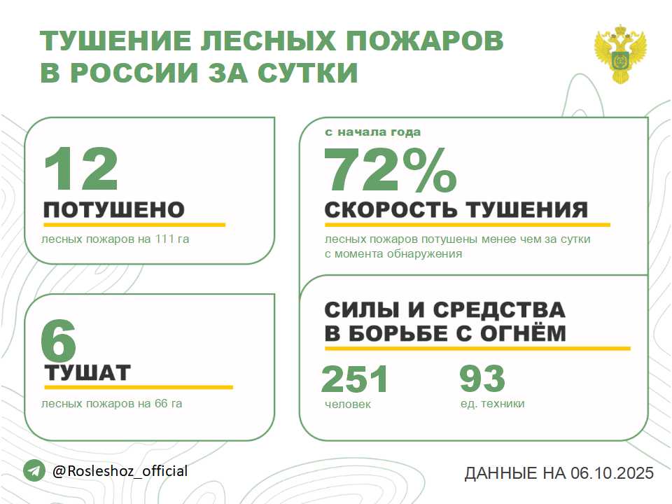 Продолжается тушение 6 лесных пожаров в 4 субъектах РФ.
