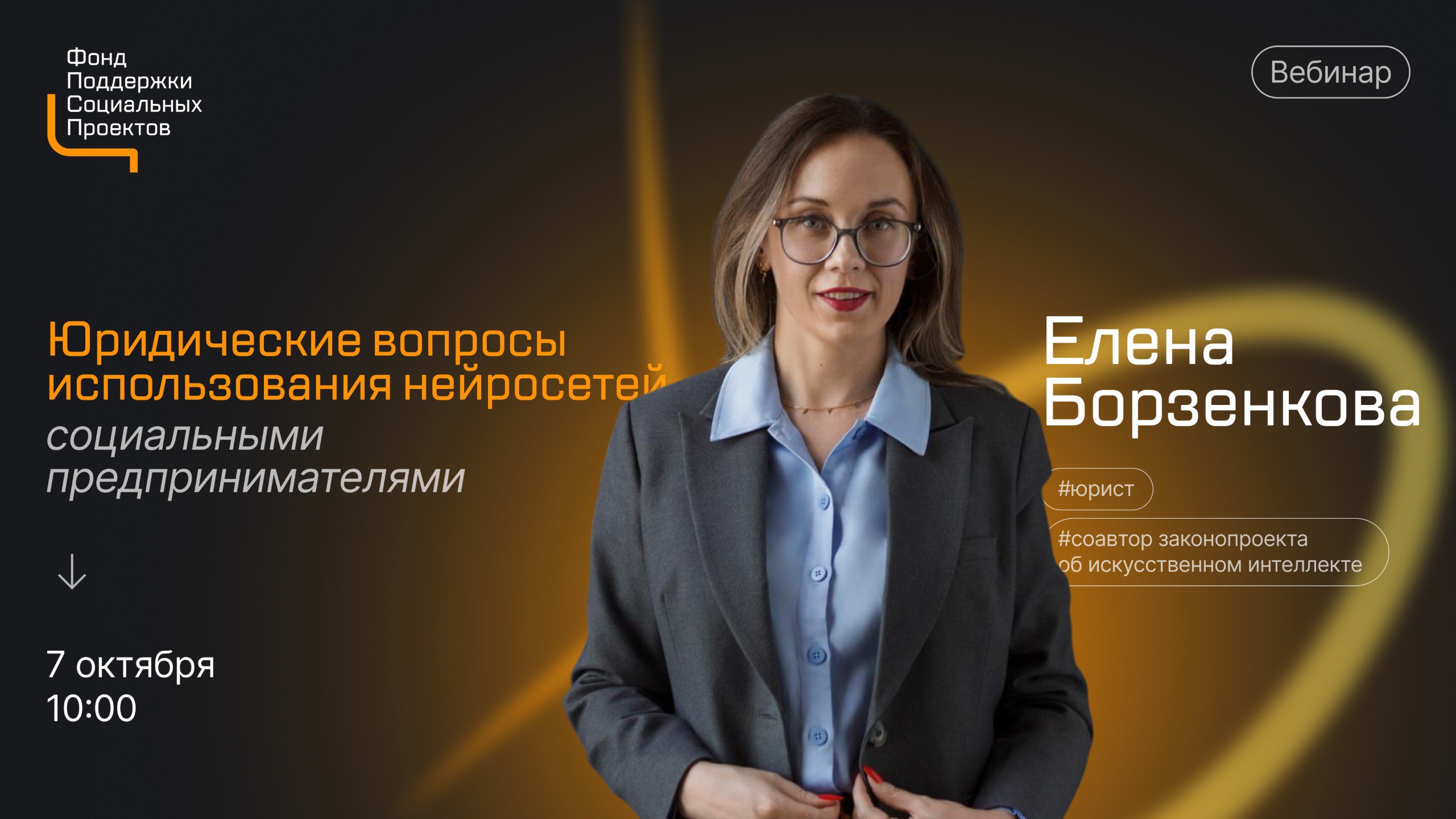 7 октября состоится экспертный вебинар с Еленой Борзенковой — практикующим юристом с 15-летним стажем и соавтором законопроекта об искусственном интеллекте.