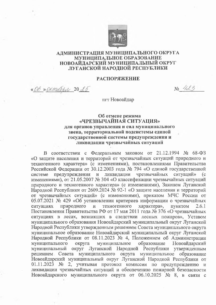 Распоряжение Администрации муниципального округа муниципальное образование Новоайдарский муниципальный округ Луганской Народной Республики "Об отмене режима «ЧРЕЗВЫЧАЙНАЯ СИТУАЦИЯ» для органов управления и сил муниципального звена, территориальной подсистемы единой государственной системы предупреждения и ликвидации чрезвычайных ситуаций"
