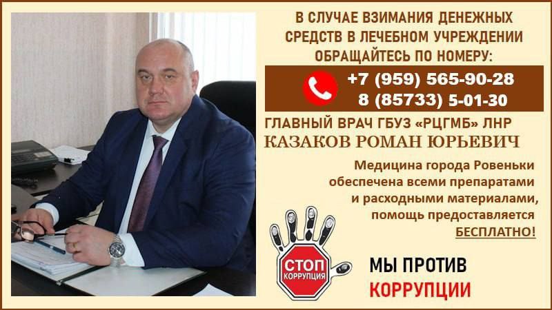 По вопросам уведомления о фактах проявления коррупции в Государственном бюджетном учреждении здравоохранения "Ровеньковская центральная городская многопрофильная больница" ЛНР, а также в целях искоренения причин и условий, порождающих коррупцию в лечебном учреждении, обеспечения прозрачности деятельности ГБУЗ "РЦГМБ" просим обращаться по указанным телефонам.