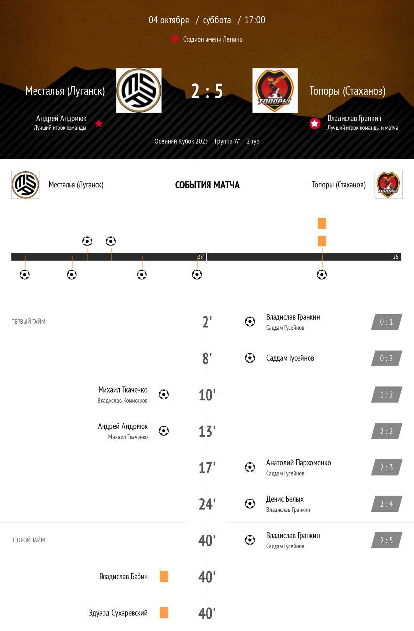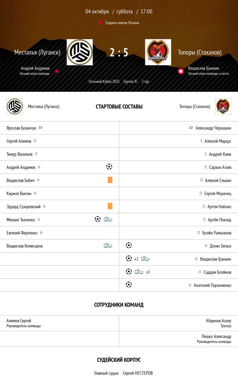 Матч завершился уверенной победой стахановских футболистов со счетом 5:2! Победу команде принесли точные удары: по два гола на счету Владислава Гранкина, а также по одному — у Гусейнова, Пархоменко и Белых.