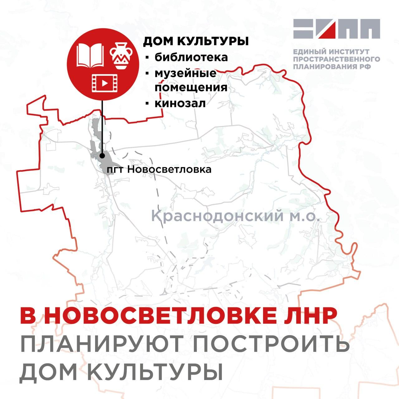 Специалисты Управления социальной инфраструктуры ЕИПП РФ предложили построить в пгт Новосветловка новое современное здание Дома культуры с библиотекой, музейными помещениями и кинозалом взамен разрушенного.