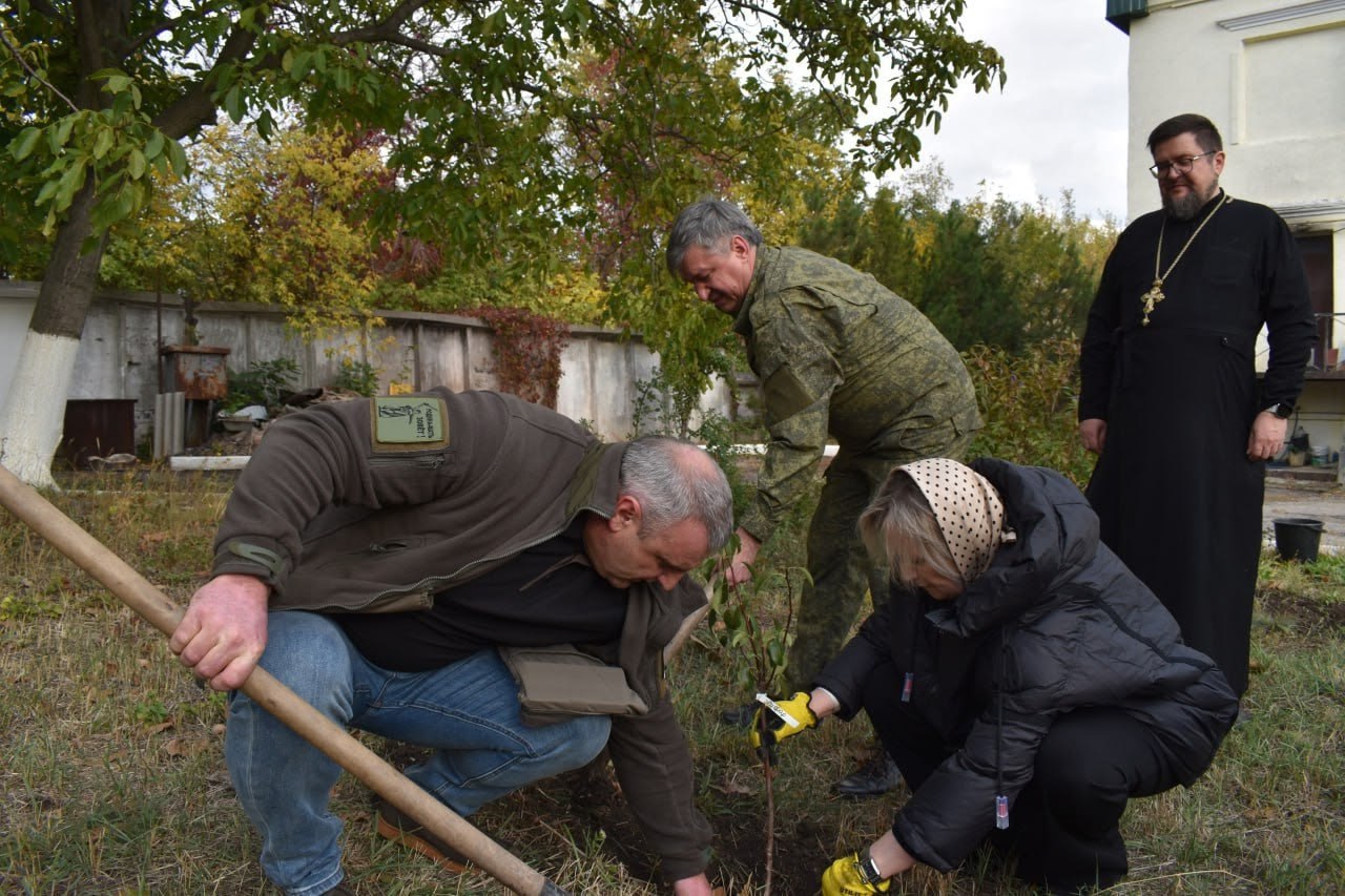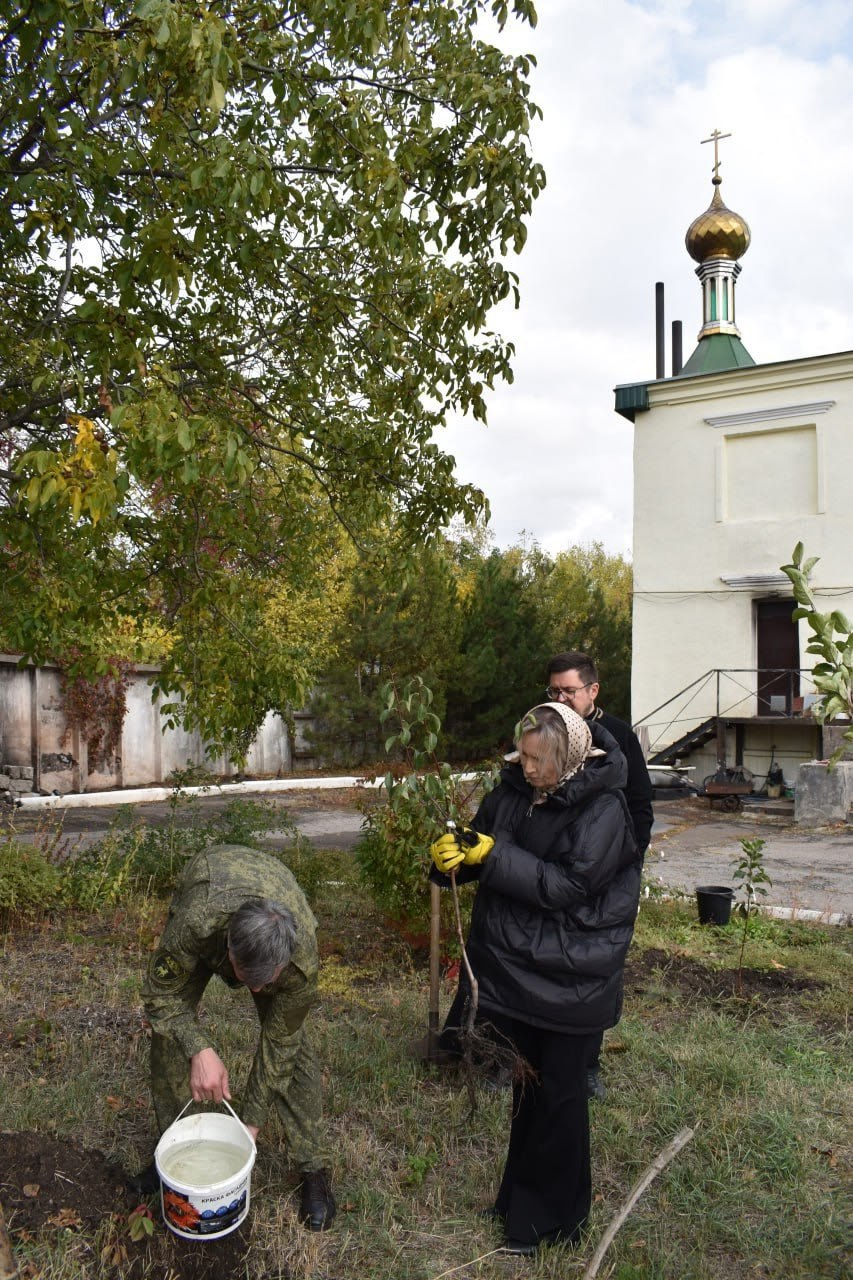 Не остались в стороне и брянковчане: казаки ГКО «Станица Брянка», председатель Совета депутатов муниципального округа Наталья Волошина и представитель шефа-региона Евгений Петраков приобрели и организовали посадку саженцев плодовых деревьев на территории Свято-Николаевского храма города.