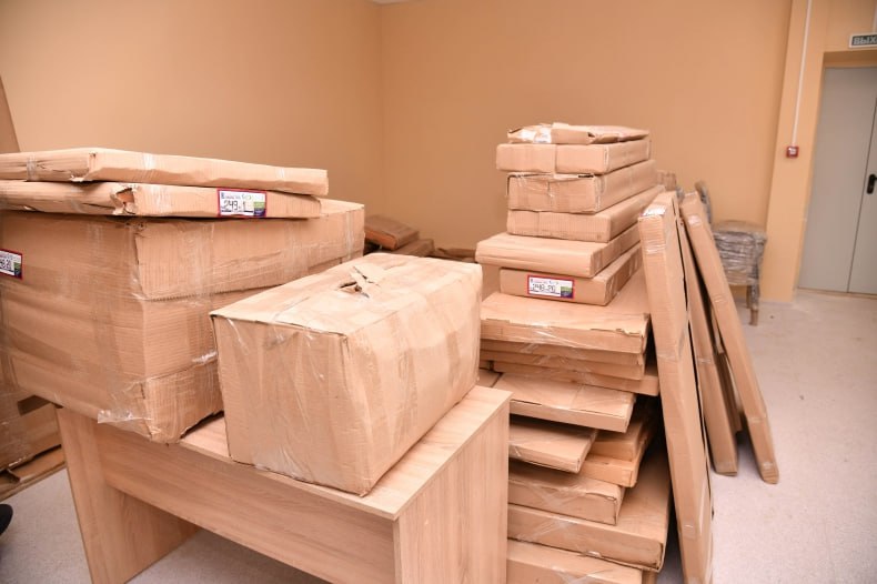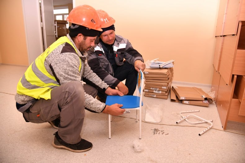 Мебель пришла в полном комплекте, сейчас специалисты выполняют ее сборку.