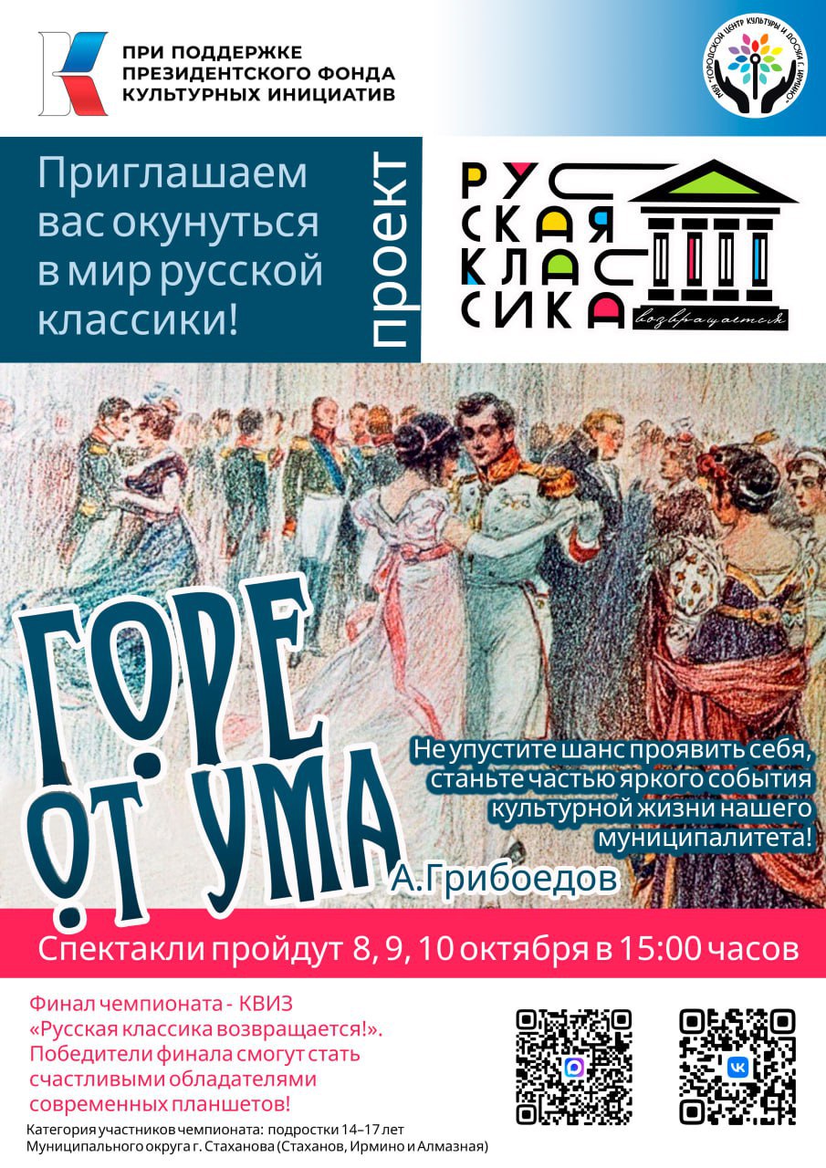 Уже завтра, 8 октября, состоится премьера спектакля "Горе от ума" в рамках проекта Литературно-театральный чемпионат "Русская классика возвращается" (при поддержке Президентского фонда культурных инициатив )