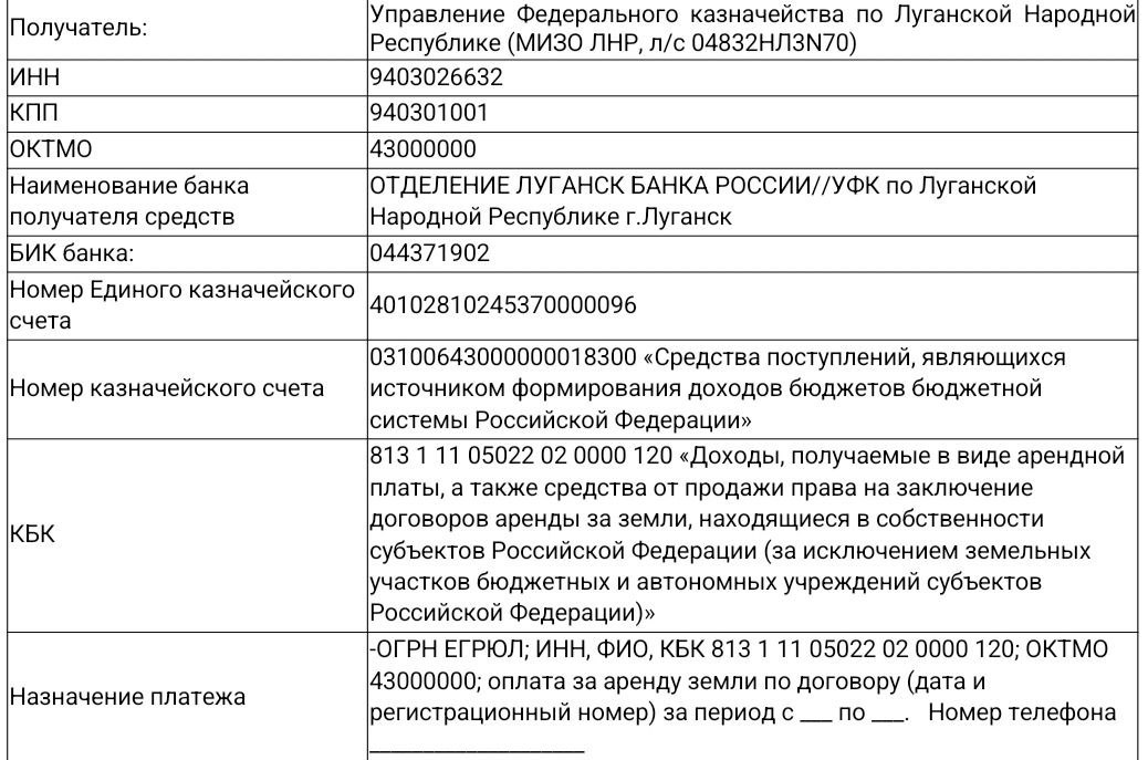 Министерство имущественных и земельных отношений Луганской Народной Республики уведомляет о необходимости уплаты арендной платы по договорам аренды земельных участков, расположенных за границами населенных пунктов, которые ранее были заключены с официальными органами Украины – районными государственными администрациями, Государственной службой Украины по вопросам геодезии, картографии и кадастра на расчетный счет Министерства имущественных и земельных отношений Луганской Народной Республики по указанным реквизитам.