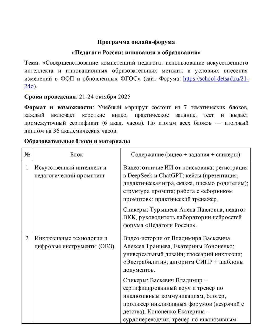 Тема: «Совершенствование компетенций педагога: использование искусственного интеллекта и инновационных образовательных методик в условиях внесения изменений в ФОП и обновленных ФГОС» (сайт Форума: https://school-detsad.ru/21-24o).