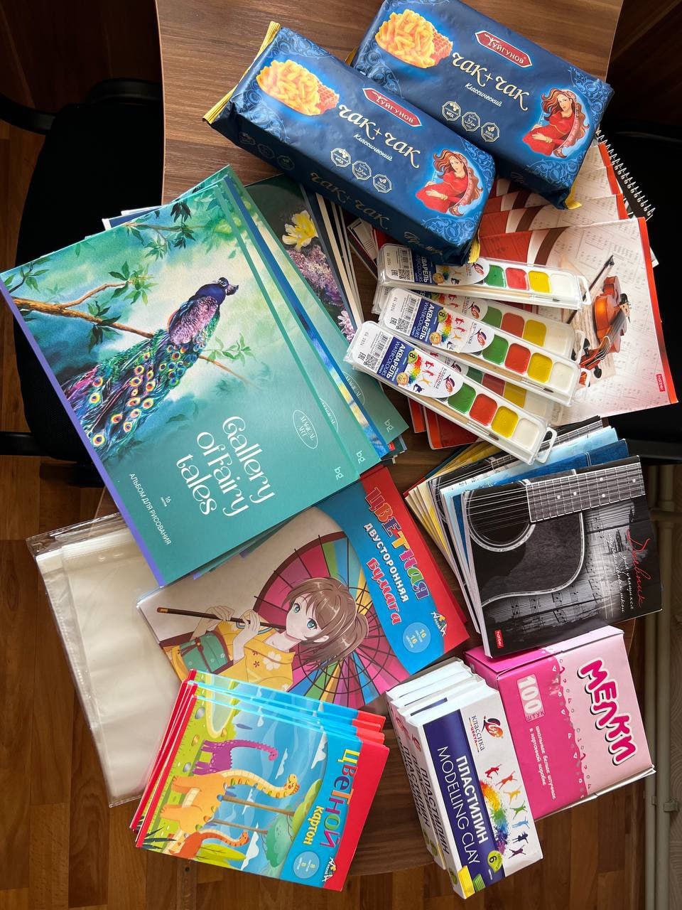 В состав посылки вошли необходимые для учебного процесса материалы: нотные тетради, акварель, пластилин, цветная бумага, мелки, альбомы для рисования.