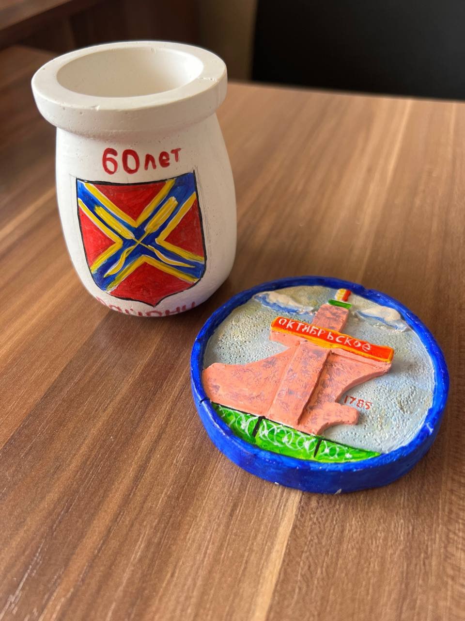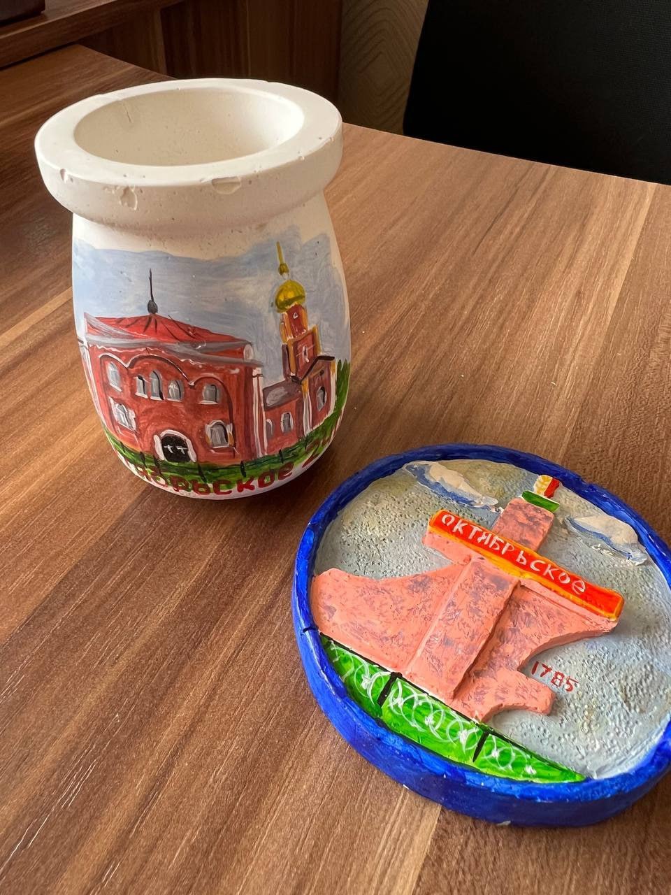 Отдельно хочется отметить поделки, сделанные на память учащимися Октябрьской ДШИ в честь празднования юбилея Октябрьского района и юбилея села Октябрьское.
