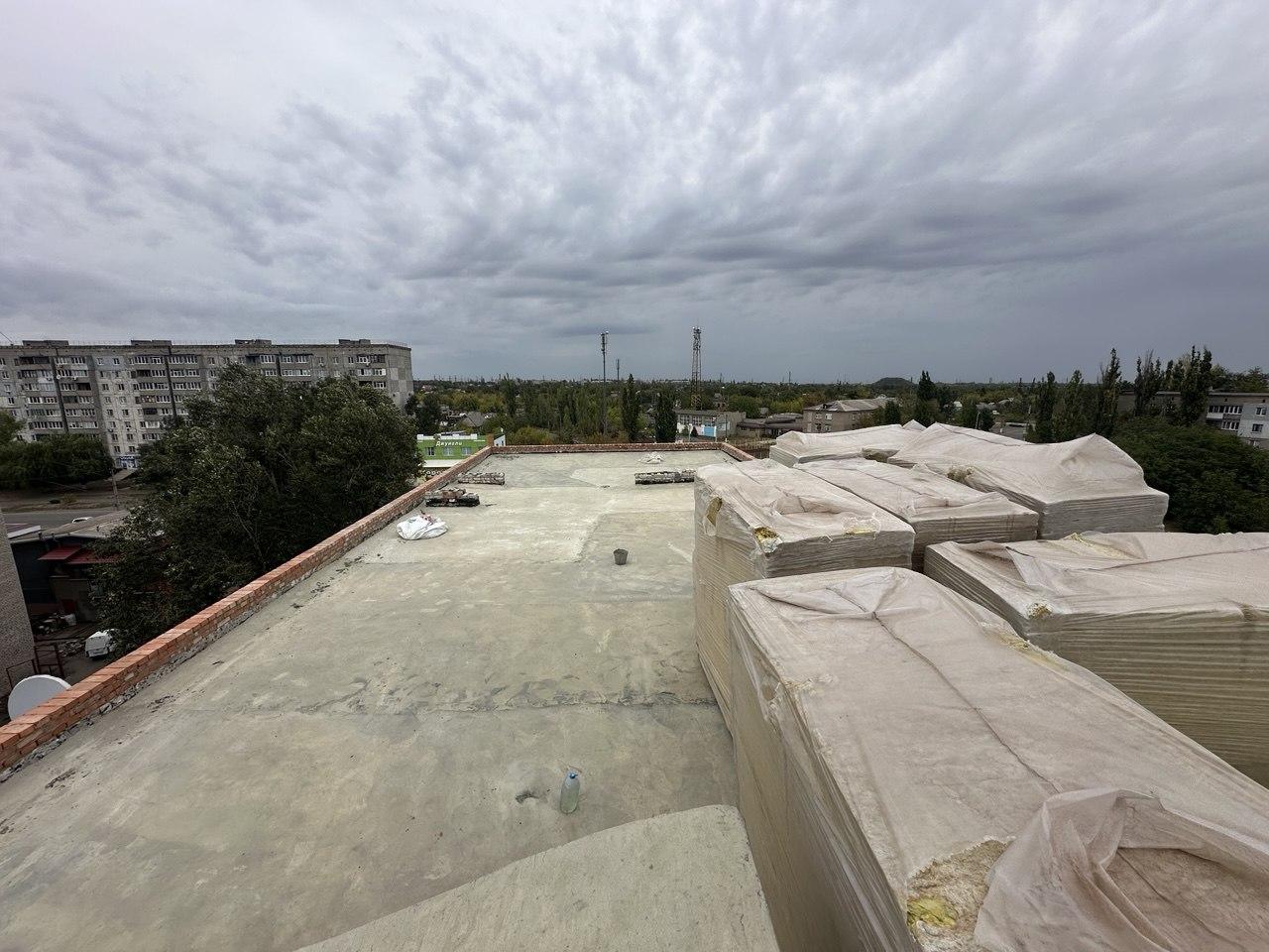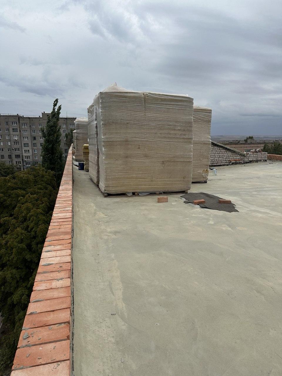 Осталось закончить верхний слой наплавляемой кровли, смонтировать парапеты из оцинкованной стали, ограждение кровли, колпаки над вентиляционными шахтами.