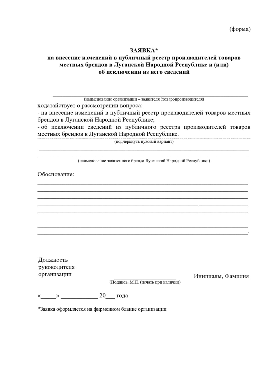 Управление развития предпринимательства Министерства экономического развития Луганской Народной Республики продолжает прием Заявок на включение в публичный реестр производителей товаров местных брендов в Луганской Народной Республике.