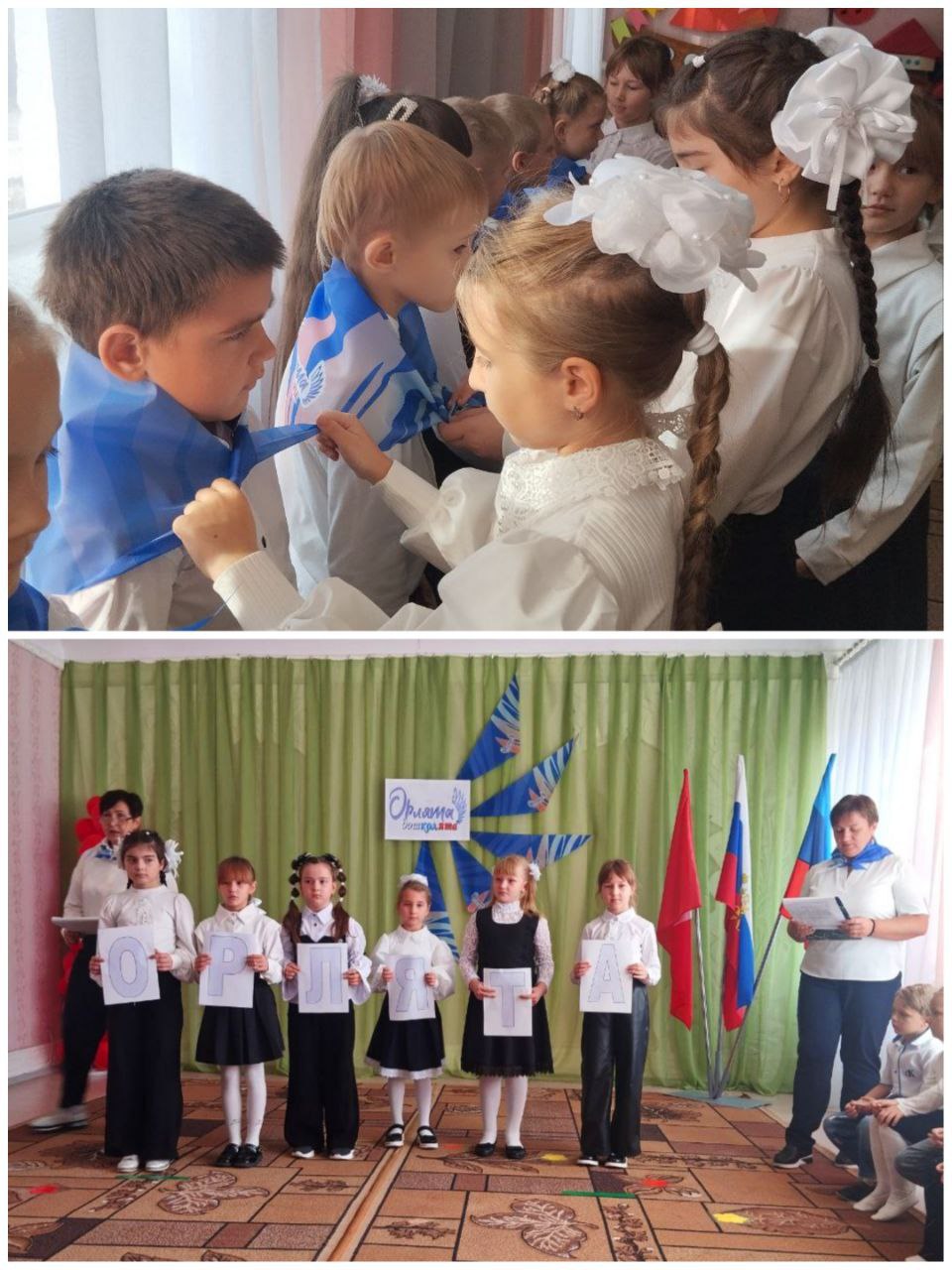 Церемония началась с гимнов РФ и ЛНР. Ребята читали стихи, пели песни, узнали легенду об «Орлятах», а учащиеся школы №4 произнесли напутственные слова и стихи. После торжественного повязывания галстуков воспитанники зачитали девиз и клятву.