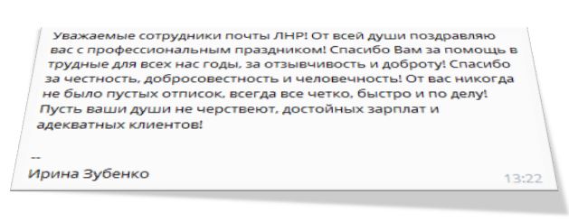 Особенно трогают слова, которые приходят от вас. Одно из них особенно запало нам в душу: "Спасибо вам за то, что вы всегда на связи, за то, что доставляете не просто письма и посылки, а частичку тепла и радости. Вы – настоящие мосты между людьми!"