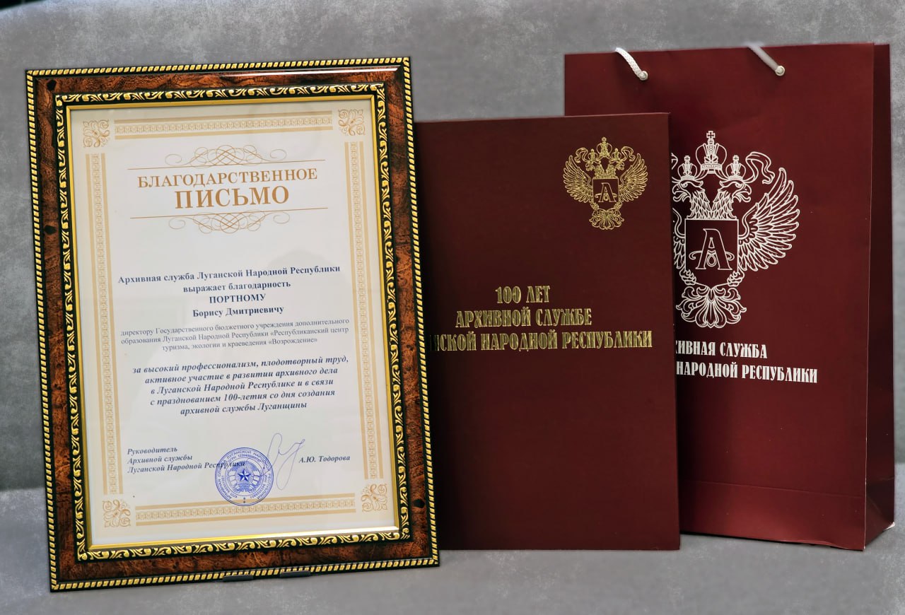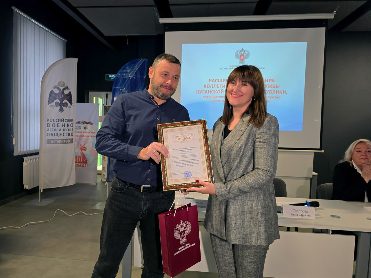 В ходе официальной части коллегии были вручены ведомственные награды. Благодарственное письмо от Архивной службы ЛНР вручили руководителю исторического парка «Россия – Моя история» Борису Дмитриевичу Портному. Его поблагодарили за высокий профессионализм и активное участие в развитии архивного дела Республики.