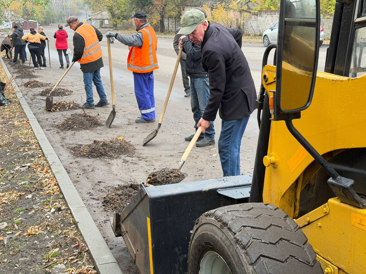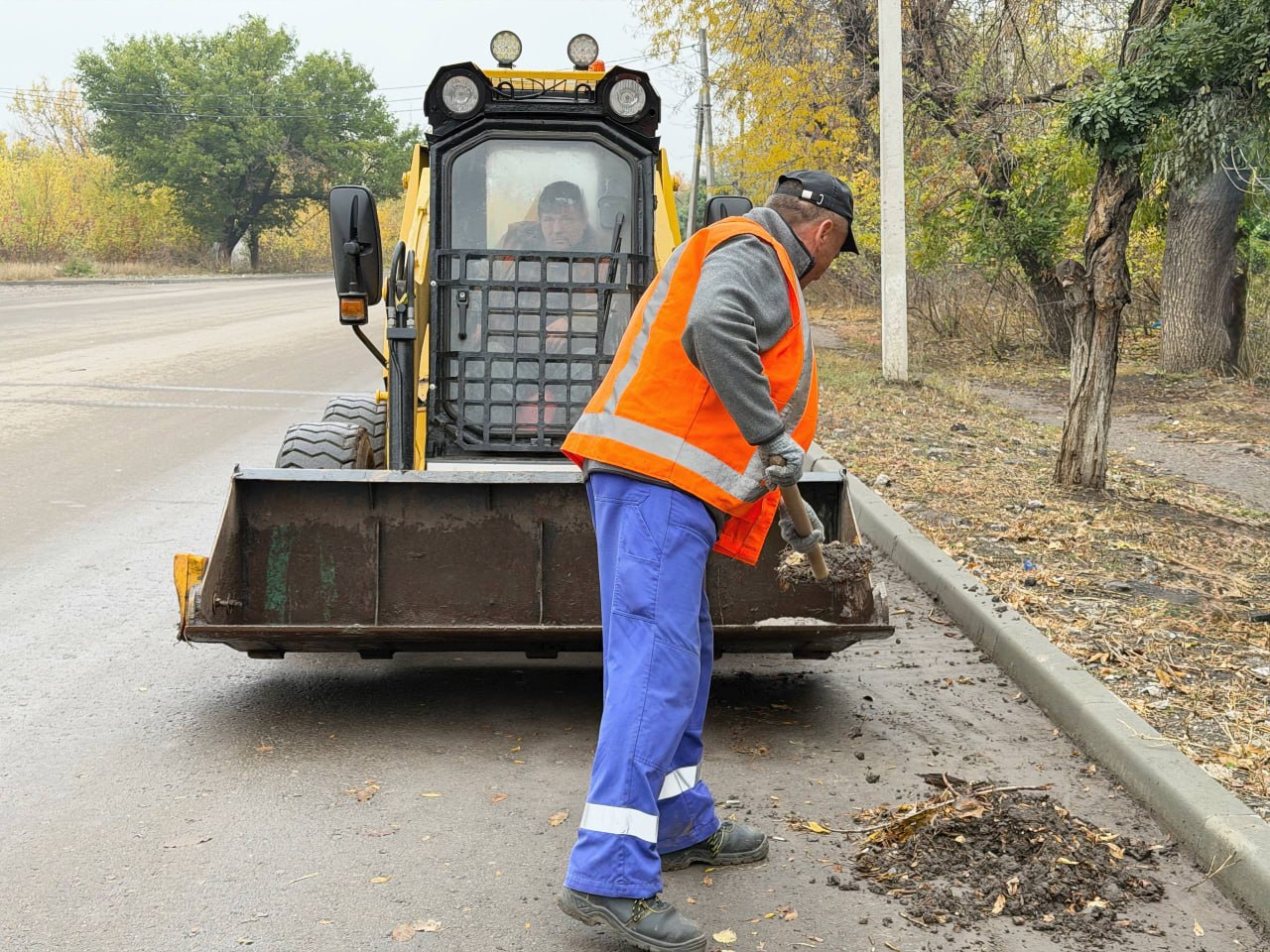 Специалисты убирают накопившийся грунт с проезжей части, используя мини-погрузчик и трактор с лафетом.