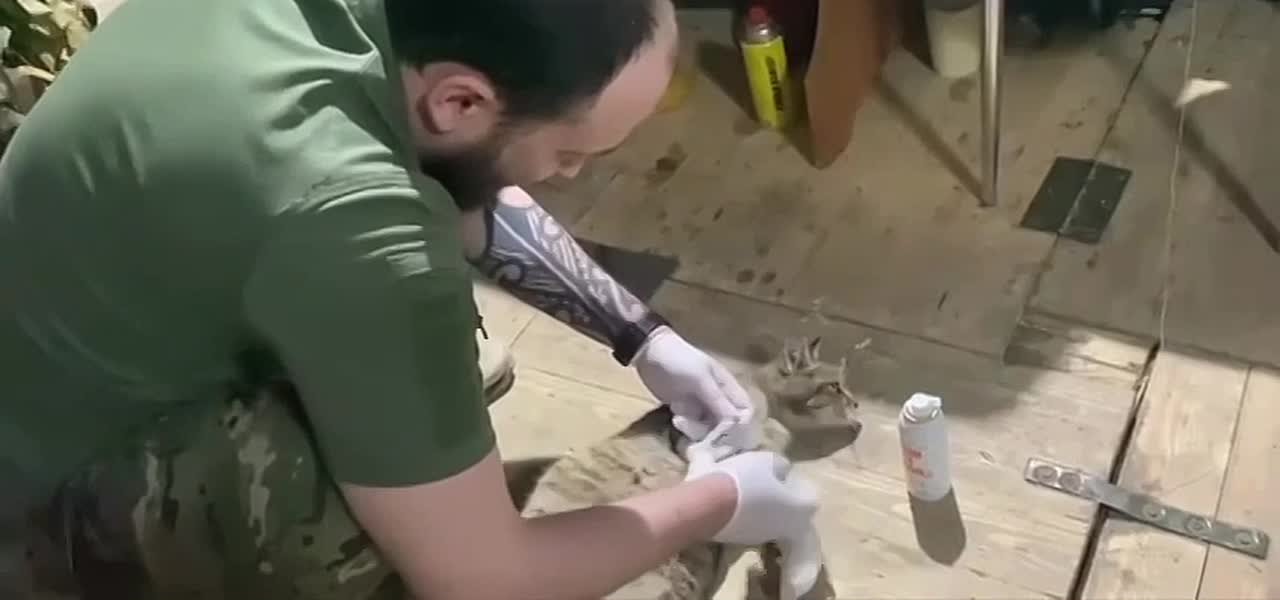 Военнослужащий оказал первую помощь, сделал перевязку и позаботился о пушистом друге.