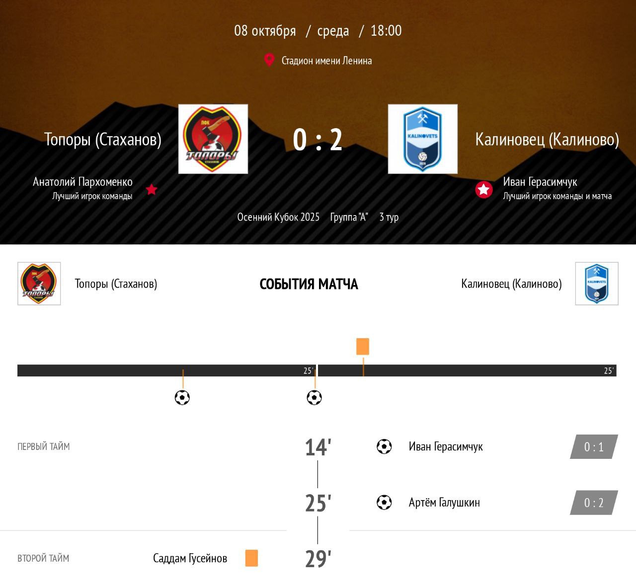Команда «Топоры» продолжает борьбу в Кубке Луганской Народной Республики по футболу 8х8. В третьем туре группового этапа нашим футболистам противостоял серьёзный соперник — неоднократный победитель местных и региональных турниров, команда «Калиновец», которая также является участником чемпионата России.