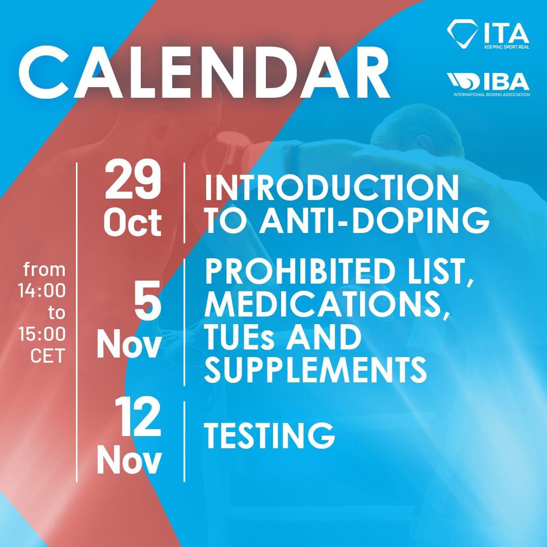 Мы рады сообщить о предстоящей серии вебинаров по вопросам чистого спорта, организованных Международным агентством тестирования ITA по поручению Международной ассоциации бокса IBA.