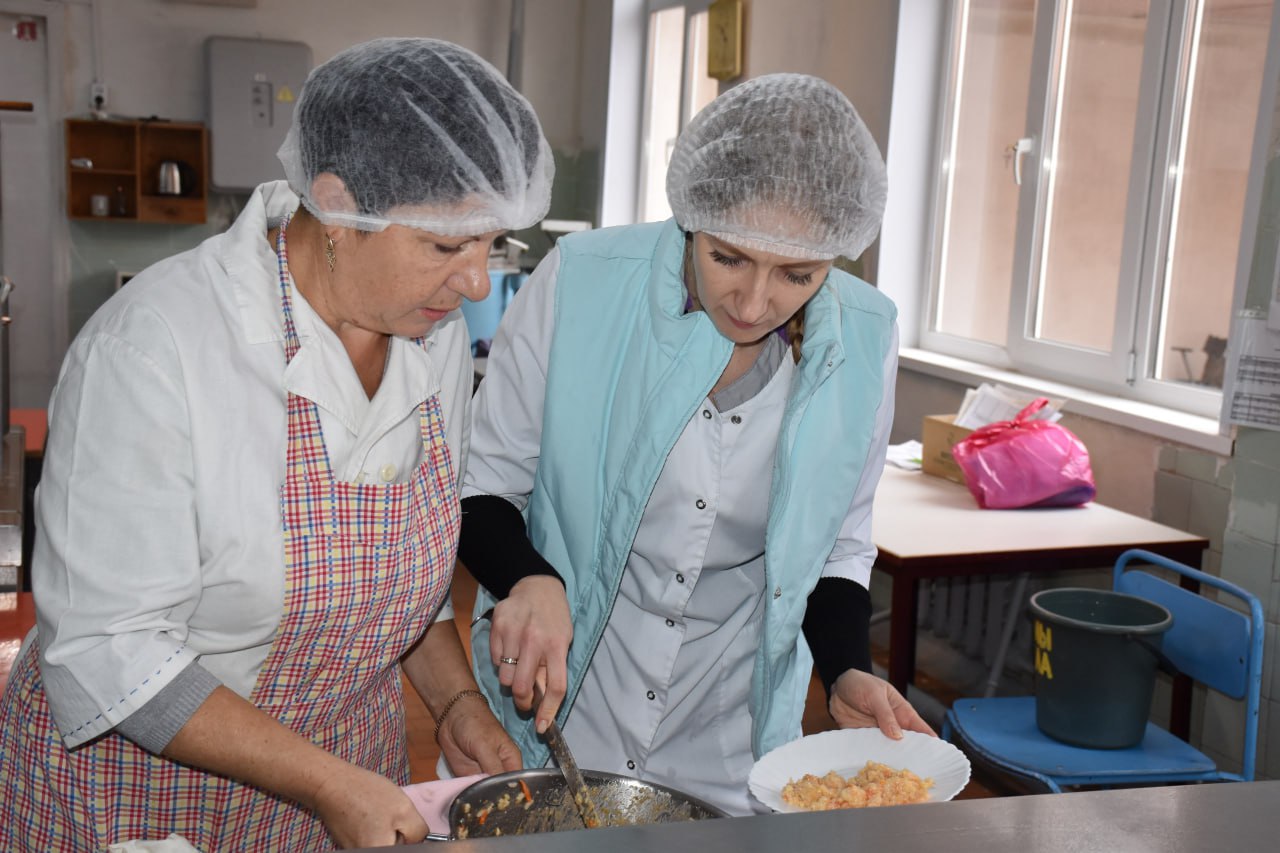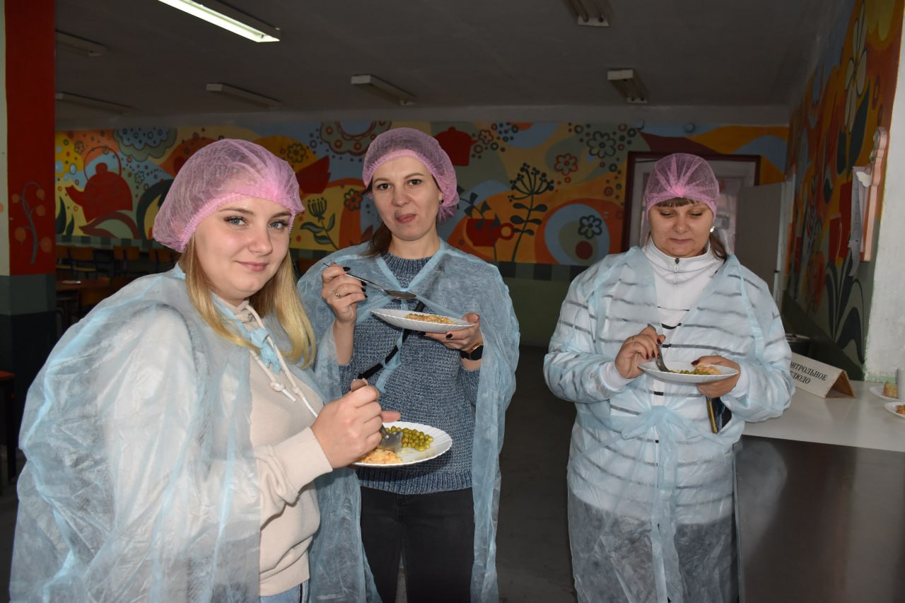 Начальник управления образования округа Кристина Прочухан совместно с директором учреждения Лидией Саидовой, депутатом Совета городского округа Евгением Воробьевым и родительской общественностью посетили школьную столовую.
