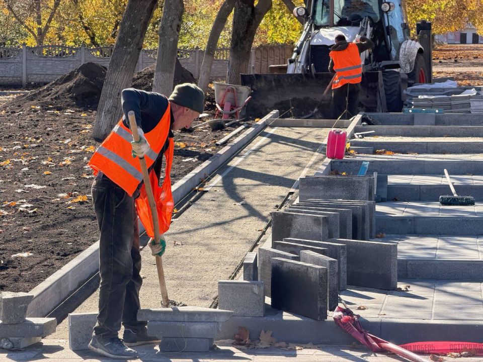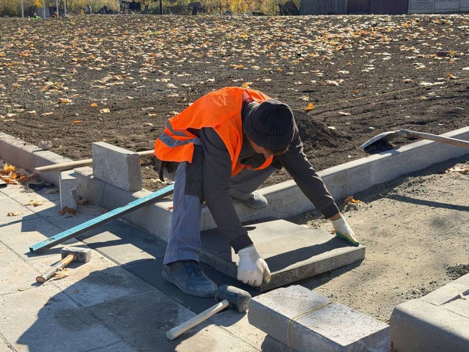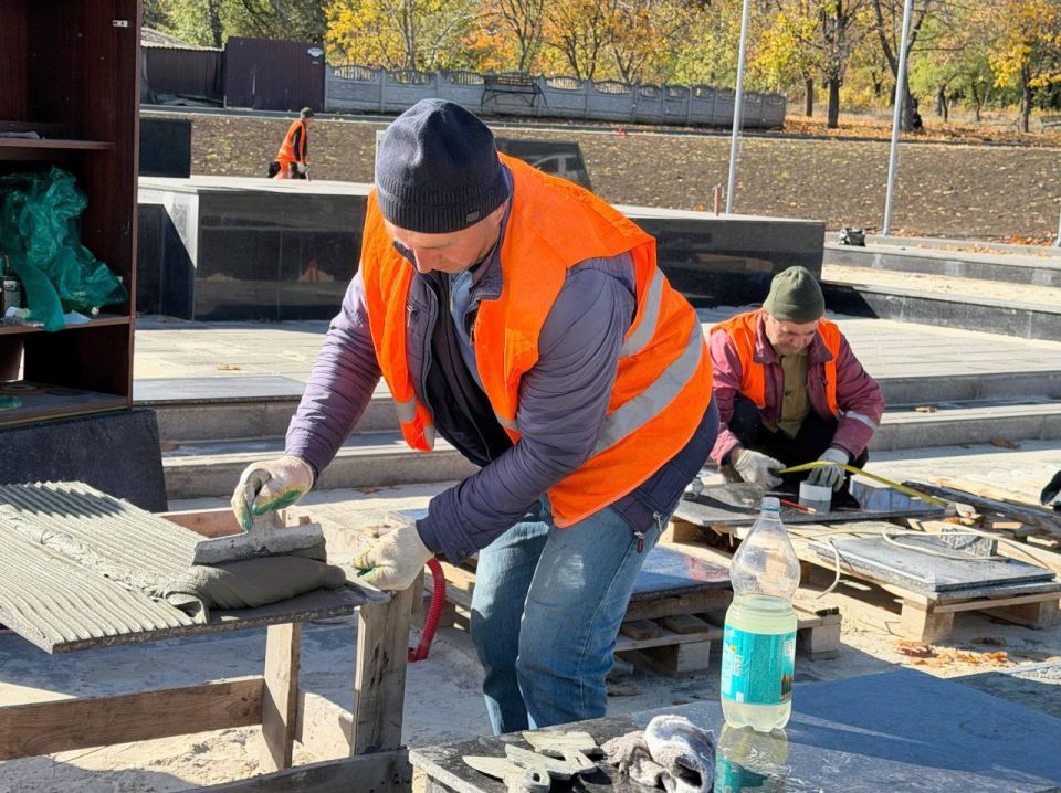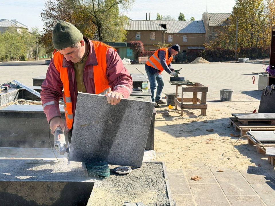 Уже проведены работы по вертикальной и горизонтальной планировке территории площади, парковой зоны и прилегающих участков, а также уложены тротуарная плитка по всему периметру площади и на тротуарных дорожках благоустраиваемого парка.