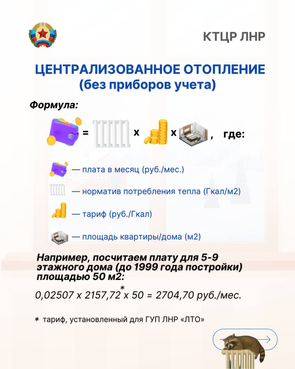 *В примере расчетов представлен тариф для ГУП ЛНР «Луганская тепловая организация». С тарифами для потребителей других организаций вы можете ознакомиться на официальном сайте Комитета в разделе «Тарифы».