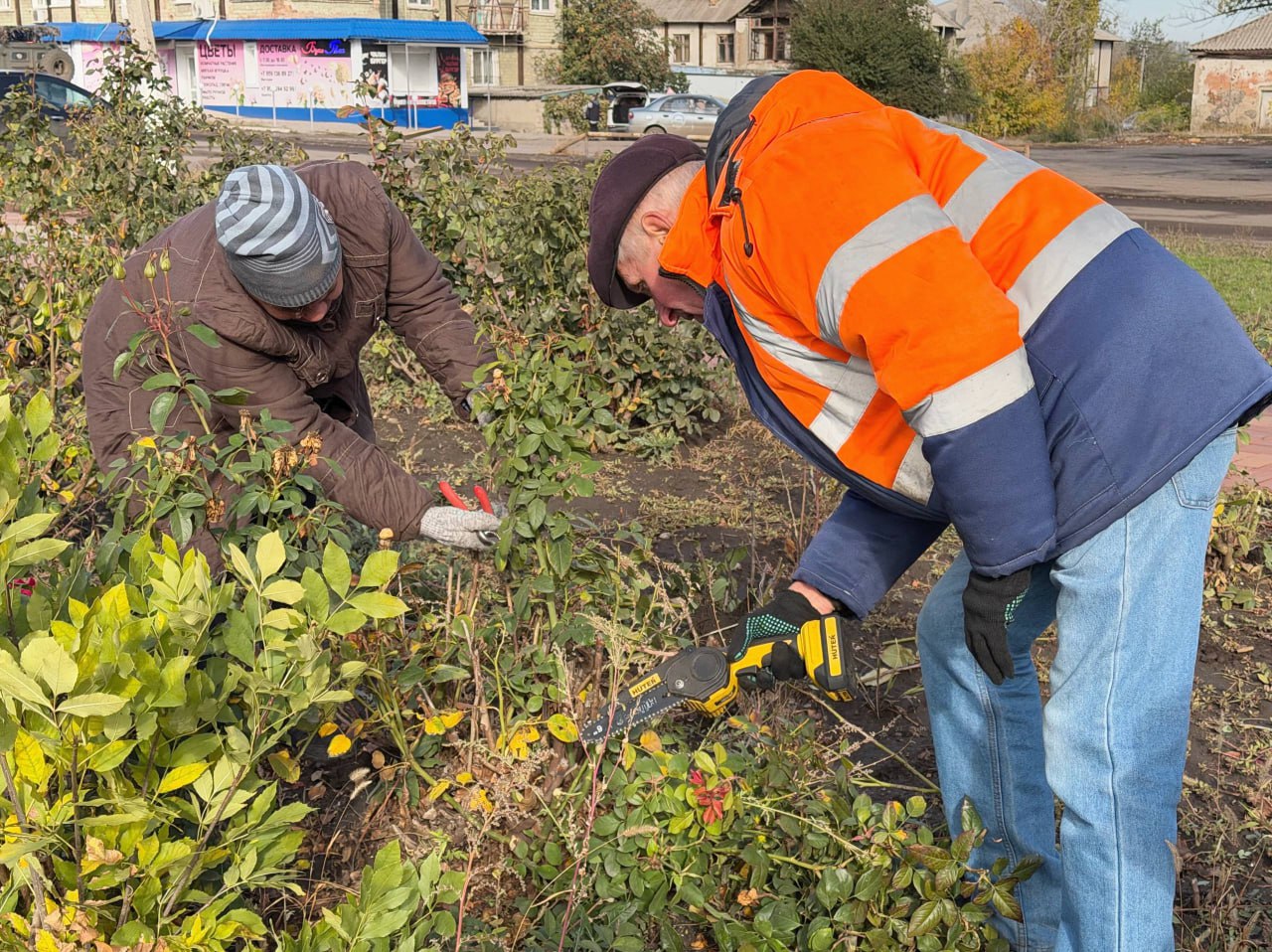 Озеленители Муниципального унитарного предприятия «Комбинат коммунальных услуг города Первомайска» обрезают высаженные кусты роз на городских клумбах, чтобы растения благополучно перезимовали и пышно зацвели весной.