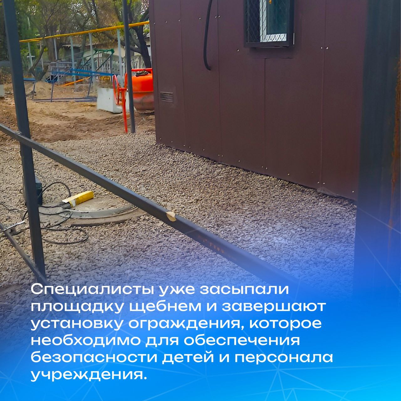 В настоящее время выполняется благоустройство прилегающей территории. Специалисты уже засыпали площадку щебнем и завершают установку ограждения, которое необходимо для обеспечения безопасности детей и персонала учреждения.