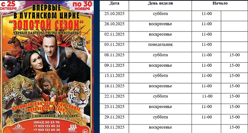 С 25 октября по 30 ноября 2025г., впервые в Луганском государственном цирке Российская государственная цирковая компания и Заслуженный артист РФ Гия Эрадзе при поддержке Министерства культуры РФ представят грандиозное цирковое шоу «Золотой сезон», собранное из самых ярких и красочных номеров легендарного продюсерского центра «Королевский цирк Гии Эрадзе».