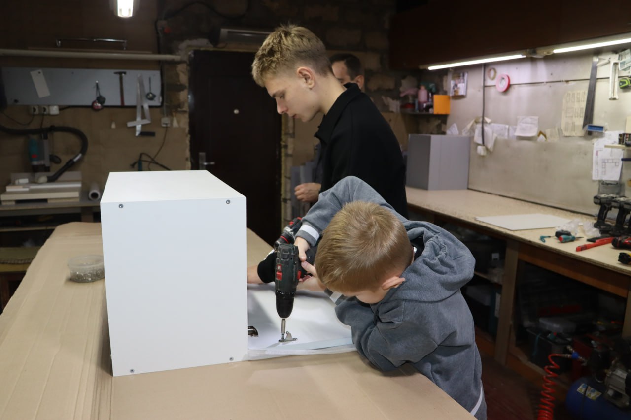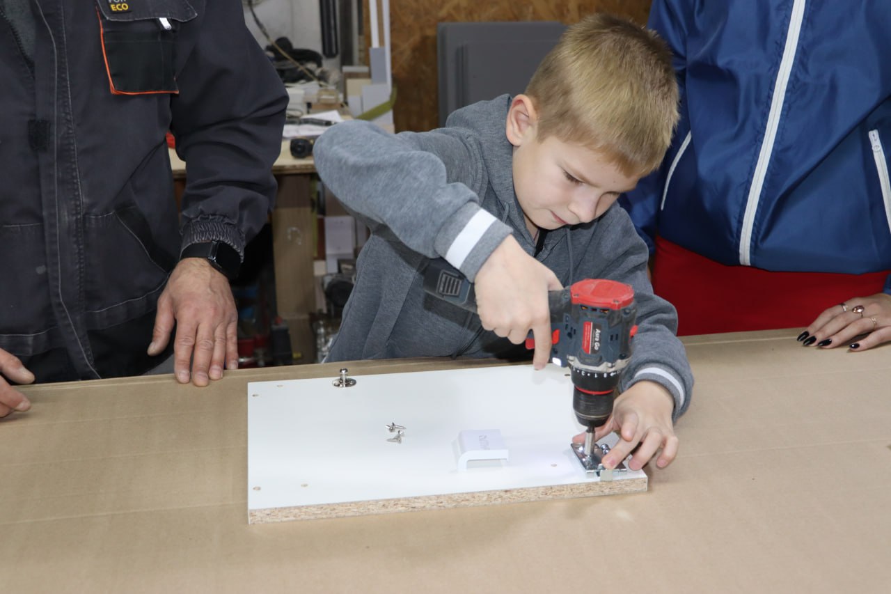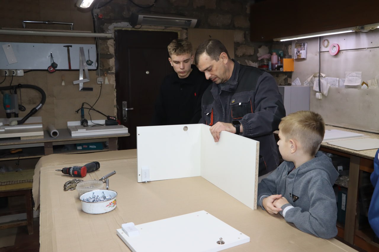 Старший сын Артём, ученик 10 класса, уже активно помогает отцу во время летних каникул: измеряет, собирает, проектирует. А младший — Матвей, которому всего восемь лет, с интересом наблюдает за работой и уверенно держит инструмент в руках.