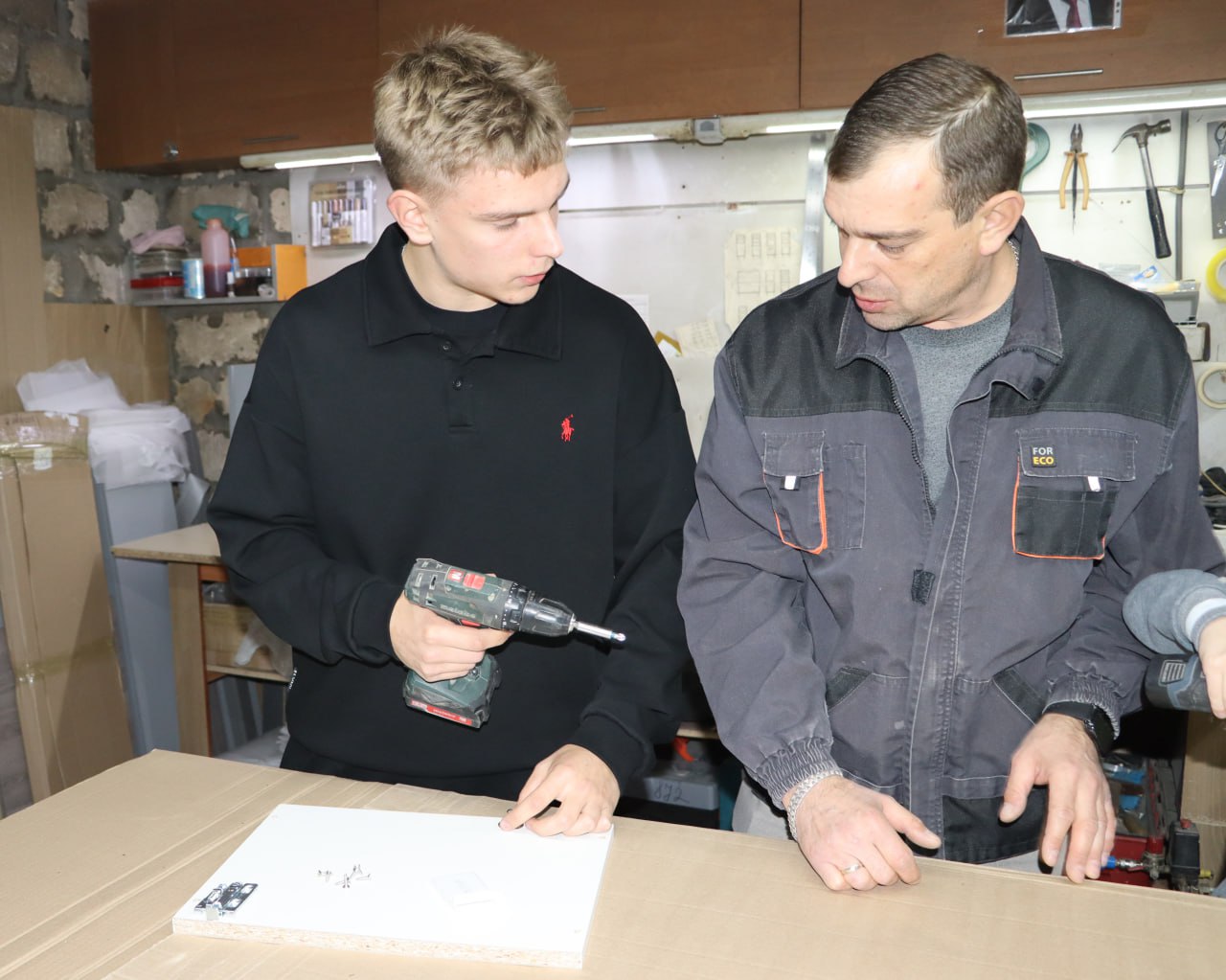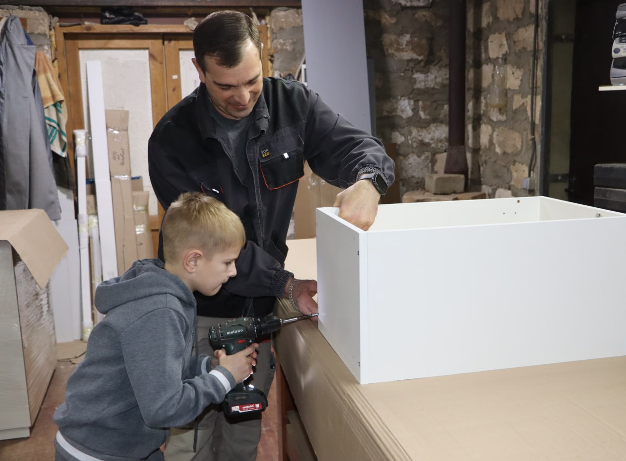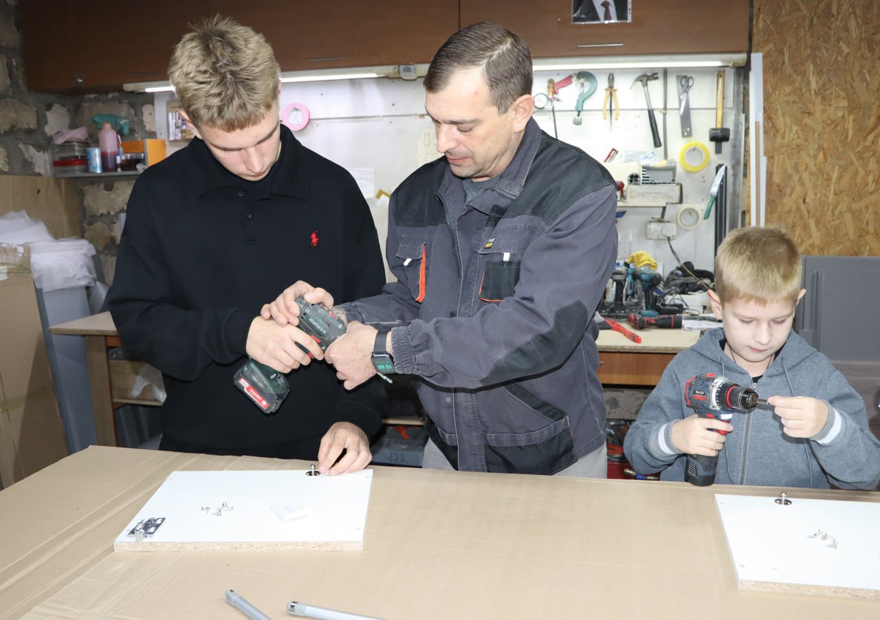 Старший сын Артём, ученик 10 класса, уже активно помогает отцу во время летних каникул: измеряет, собирает, проектирует. А младший — Матвей, которому всего восемь лет, с интересом наблюдает за работой и уверенно держит инструмент в руках.